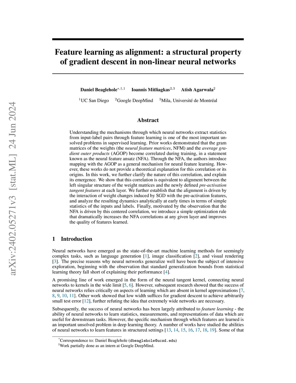 Understanding the mechanisms through which neural networks extract statistics from input-label pairs through feature learning is one of the most important unsolved problems in supervised learning. Prior works demonstrated that the gram matrices of the weights (the neural feature matrices, NFM) and the average gradient outer products (AGOP) become correlated during training, in a statement known as the neural feature ansatz (NFA). Through the NFA, the authors introduce mapping with the AGOP as a general mechanism for neural feature learning. However, these works do not provide a theoretical explanation for this correlation or its origins. In this work, we further clarify the nature of this correlation, and explain its emergence. We show that this correlation is equivalent to alignment between the left singular structure of the weight matrices and the newly defined pre-activation tangent features at each layer. We further establish that the alignment is driven by the interaction of weight changes induced by SGD with the pre-activation features, and analyze the resulting dynamics analytically at early times in terms of simple statistics of the inputs and labels. Finally, motivated by the observation that the NFA is driven by this centered correlation, we introduce a simple optimization rule that dramatically increases the NFA correlations at any given layer and improves the quality of features learned.