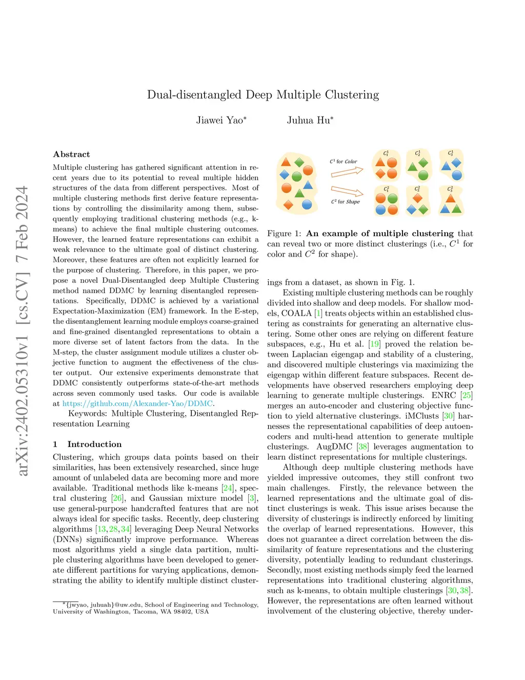 Multiple clustering has gathered significant attention in recent years due to its potential to reveal multiple hidden structures of the data from different perspectives. Most of multiple clustering methods first derive feature representations by controlling the dissimilarity among them, subsequently employing traditional clustering methods (e.g., k-means) to achieve the final multiple clustering outcomes. However, the learned feature representations can exhibit a weak relevance to the ultimate goal of distinct clustering. Moreover, these features are often not explicitly learned for the purpose of clustering. Therefore, in this paper, we propose a novel Dual-Disentangled deep Multiple Clustering method named DDMC by learning disentangled representations. Specifically, DDMC is achieved by a variational Expectation-Maximization (EM) framework. In the E-step, the disentanglement learning module employs coarse-grained and fine-grained disentangled representations to obtain a more diverse set of latent factors from the data. In the M-step, the cluster assignment module utilizes a cluster objective function to augment the effectiveness of the cluster output. Our extensive experiments demonstrate that DDMC consistently outperforms state-of-the-art methods across seven commonly used tasks. Our code is available at https://github.com/Alexander-Yao/DDMC.