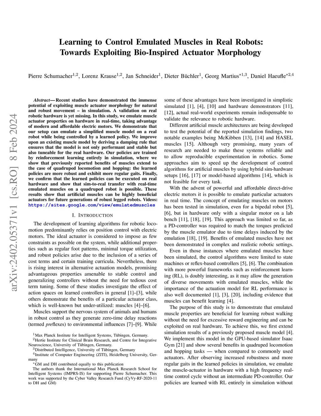 Recent studies have demonstrated the immense potential of exploiting muscle actuator morphology for natural and robust movement -- in simulation. A validation on real robotic hardware is yet missing. In this study, we emulate muscle actuator properties on hardware in real-time, taking advantage of modern and affordable electric motors. We demonstrate that our setup can emulate a simplified muscle model on a real robot while being controlled by a learned policy. We improve upon an existing muscle model by deriving a damping rule that ensures that the model is not only performant and stable but also tuneable for the real hardware. Our policies are trained by reinforcement learning entirely in simulation, where we show that previously reported benefits of muscles extend to the case of quadruped locomotion and hopping: the learned policies are more robust and exhibit more regular gaits. Finally, we confirm that the learned policies can be executed on real hardware and show that sim-to-real transfer with real-time emulated muscles on a quadruped robot is possible. These results show that artificial muscles can be highly beneficial actuators for future generations of robust legged robots.