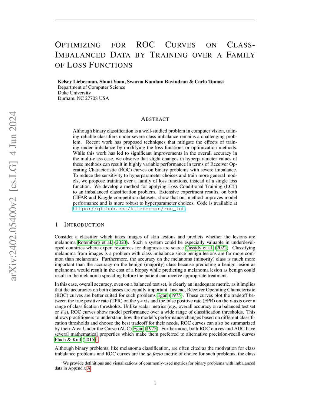 Although binary classification is a well-studied problem in computer vision, training reliable classifiers under severe class imbalance remains a challenging problem. Recent work has proposed techniques that mitigate the effects of training under imbalance by modifying the loss functions or optimization methods. While this work has led to significant improvements in the overall accuracy in the multi-class case, we observe that slight changes in hyperparameter values of these methods can result in highly variable performance in terms of Receiver Operating Characteristic (ROC) curves on binary problems with severe imbalance. To reduce the sensitivity to hyperparameter choices and train more general models, we propose training over a family of loss functions, instead of a single loss function. We develop a method for applying Loss Conditional Training (LCT) to an imbalanced classification problem. Extensive experiment results, on both CIFAR and Kaggle competition datasets, show that our method improves model performance and is more robust to hyperparameter choices. Code is available at https://github.com/klieberman/roc_lct.