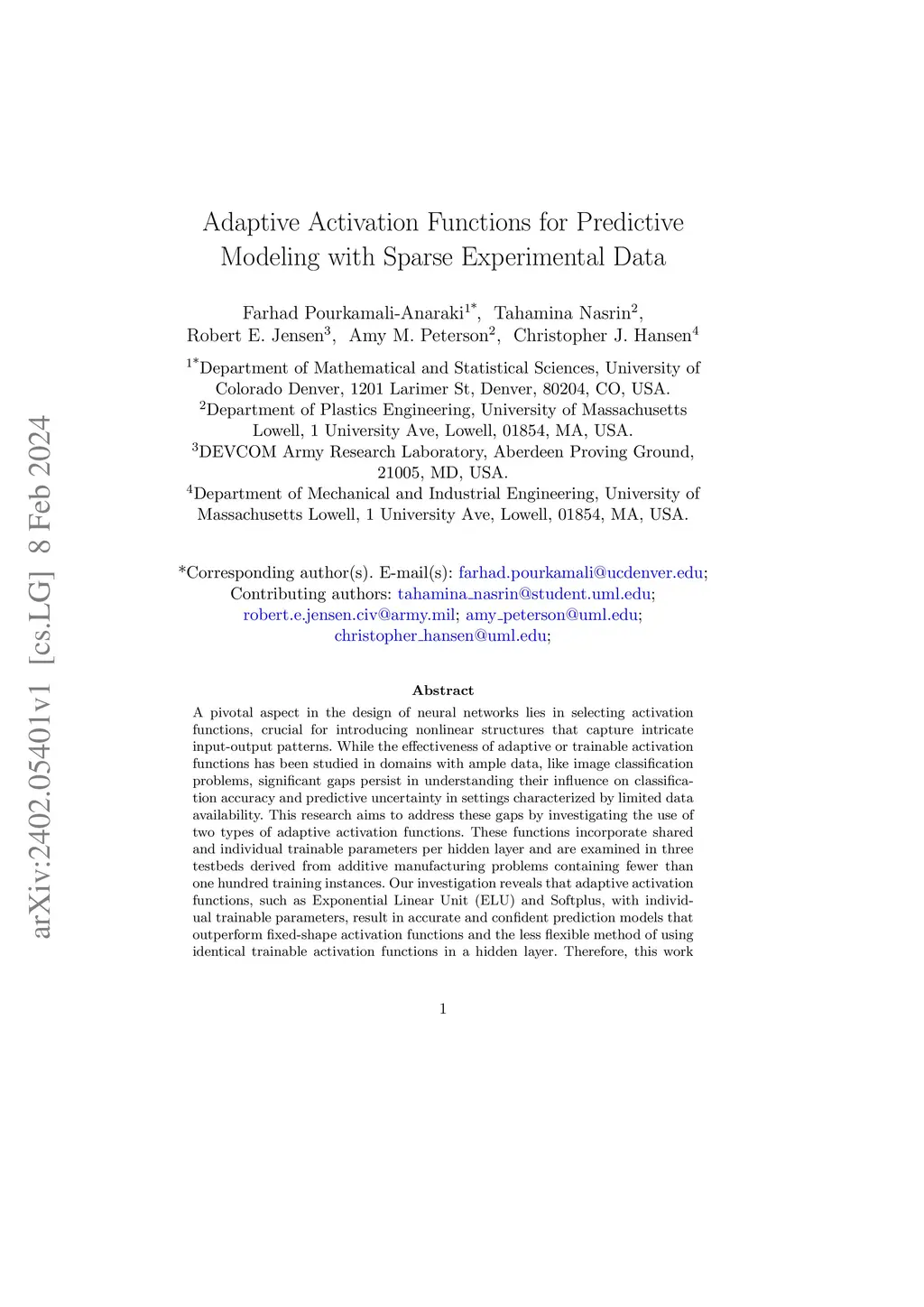 A pivotal aspect in the design of neural networks lies in selecting activation functions, crucial for introducing nonlinear structures that capture intricate input-output patterns. While the effectiveness of adaptive or trainable activation functions has been studied in domains with ample data, like image classification problems, significant gaps persist in understanding their influence on classification accuracy and predictive uncertainty in settings characterized by limited data availability. This research aims to address these gaps by investigating the use of two types of adaptive activation functions. These functions incorporate shared and individual trainable parameters per hidden layer and are examined in three testbeds derived from additive manufacturing problems containing fewer than one hundred training instances. Our investigation reveals that adaptive activation functions, such as Exponential Linear Unit (ELU) and Softplus, with individual trainable parameters, result in accurate and confident prediction models that outperform fixed-shape activation functions and the less flexible method of using identical trainable activation functions in a hidden layer. Therefore, this work presents an elegant way of facilitating the design of adaptive neural networks in scientific and engineering problems.