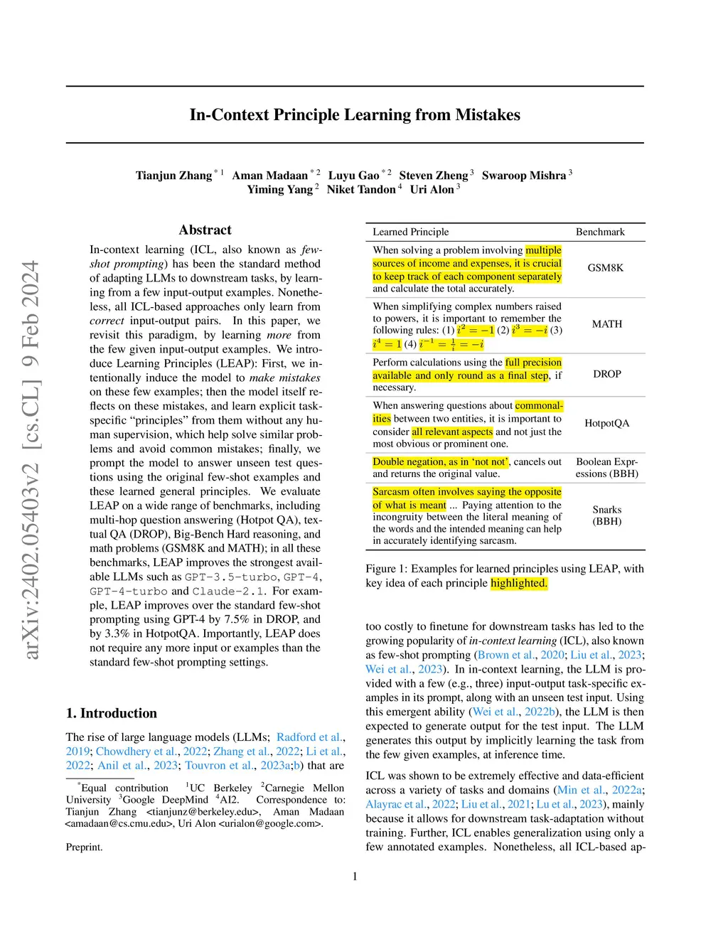 In-context learning (ICL, also known as few-shot prompting) has been the standard method of adapting LLMs to downstream tasks, by learning from a few input-output examples. Nonetheless, all ICL-based approaches only learn from correct input-output pairs. In this paper, we revisit this paradigm, by learning more from the few given input-output examples. We introduce Learning Principles (LEAP): First, we intentionally induce the model to make mistakes on these few examples; then we reflect on these mistakes, and learn explicit task-specific "principles" from them, which help solve similar problems and avoid common mistakes; finally, we prompt the model to answer unseen test questions using the original few-shot examples and these learned general principles. We evaluate LEAP on a wide range of benchmarks, including multi-hop question answering (Hotpot QA), textual QA (DROP), Big-Bench Hard reasoning, and math problems (GSM8K and MATH); in all these benchmarks, LEAP improves the strongest available LLMs such as GPT-3.5-turbo, GPT-4, GPT-4 turbo and Claude-2.1. For example, LEAP improves over the standard few-shot prompting using GPT-4 by 7.5% in DROP, and by 3.3% in HotpotQA. Importantly, LEAP does not require any more input or examples than the standard few-shot prompting settings.