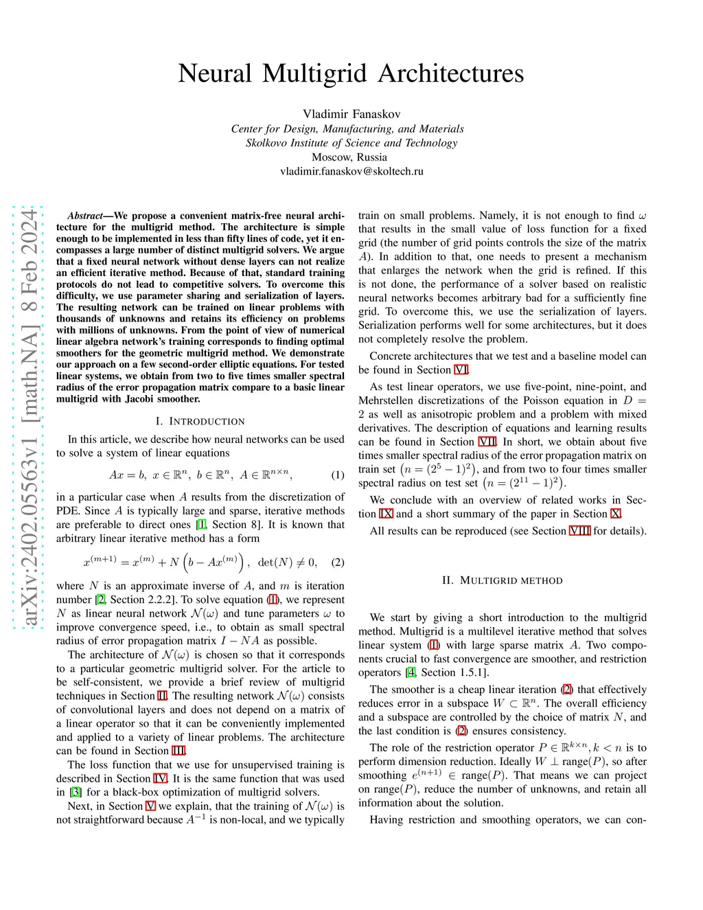 We propose a convenient matrix-free neural architecture for the multigrid method. The architecture is simple enough to be implemented in less than fifty lines of code, yet it encompasses a large number of distinct multigrid solvers. We argue that a fixed neural network without dense layers can not realize an efficient iterative method. Because of that, standard training protocols do not lead to competitive solvers. To overcome this difficulty, we use parameter sharing and serialization of layers. The resulting network can be trained on linear problems with thousands of unknowns and retains its efficiency on problems with millions of unknowns. From the point of view of numerical linear algebra network's training corresponds to finding optimal smoothers for the geometric multigrid method. We demonstrate our approach on a few second-order elliptic equations. For tested linear systems, we obtain from two to five times smaller spectral radius of the error propagation matrix compare to a basic linear multigrid with Jacobi smoother.