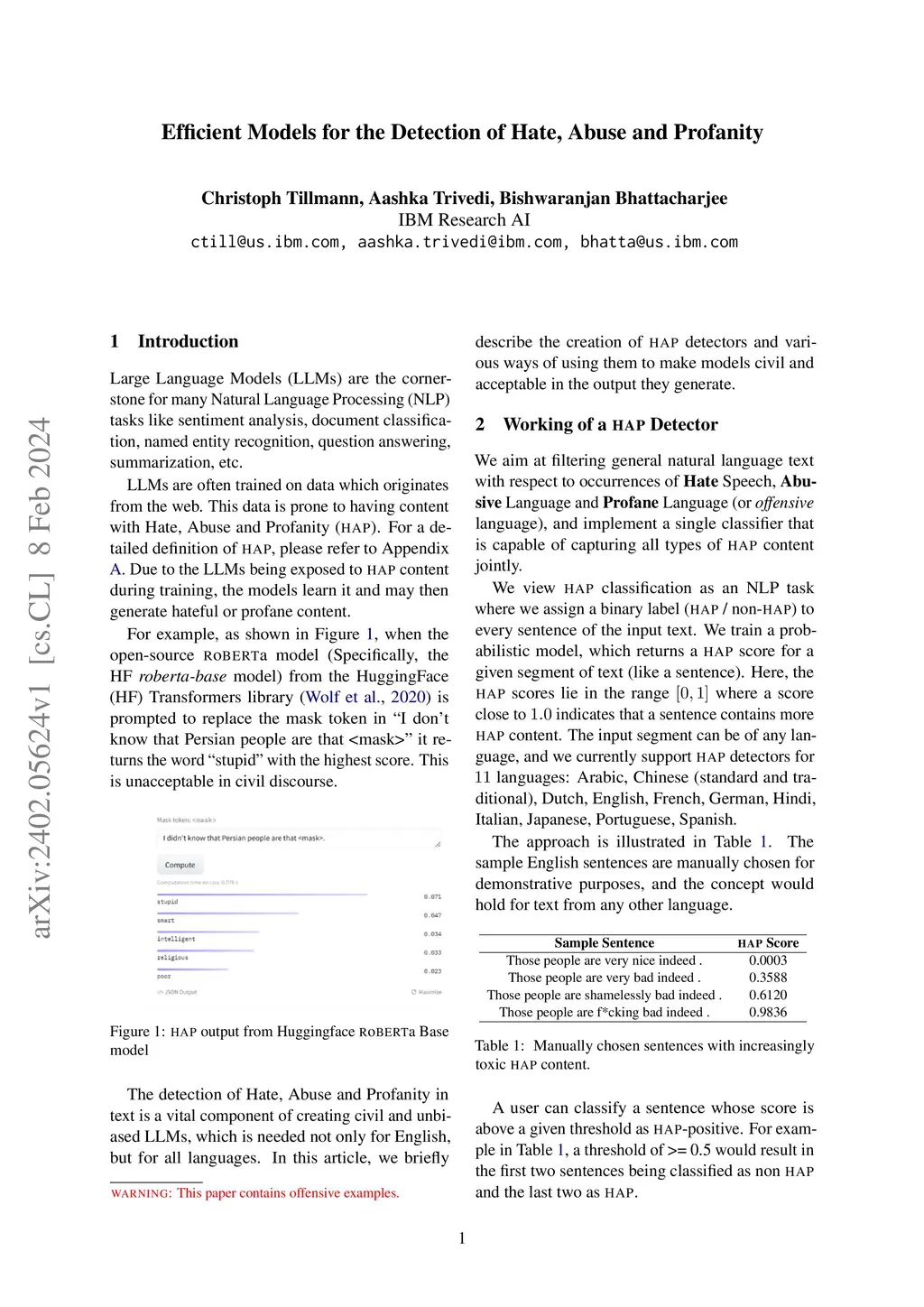 Large Language Models (LLMs) are the cornerstone for many Natural Language Processing (NLP) tasks like sentiment analysis, document classification, named entity recognition, question answering, summarization, etc. LLMs are often trained on data which originates from the web. This data is prone to having content with Hate, Abuse and Profanity (HAP). For a detailed definition of HAP, please refer to the Appendix. Due to the LLMs being exposed to HAP content during training, the models learn it and may then generate hateful or profane content. For example, when the open-source RoBERTa model (specifically, the RoBERTA base model) from the HuggingFace (HF) Transformers library is prompted to replace the mask token in `I do not know that Persian people are that MASK` it returns the word `stupid` with the highest score. This is unacceptable in civil discourse.The detection of Hate, Abuse and Profanity in text is a vital component of creating civil and unbiased LLMs, which is needed not only for English, but for all languages. In this article, we briefly describe the creation of HAP detectors and various ways of using them to make models civil and acceptable in the output they generate.