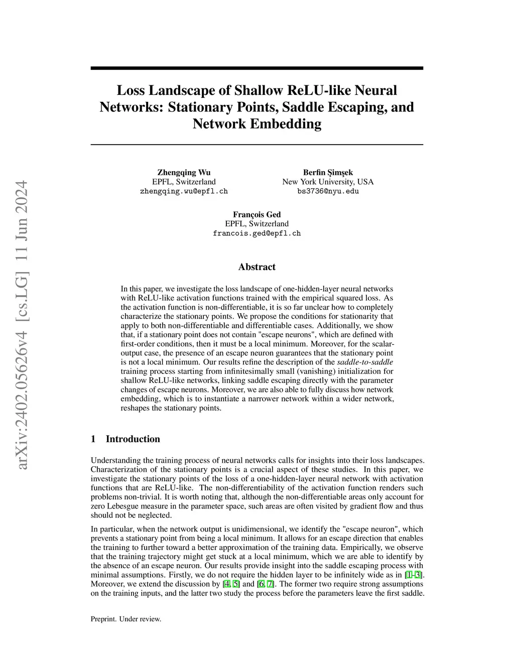 Loss Landscape of Shallow ReLU-like Neural Networks: Stationary Points, Saddle Escape, and Network Embedding