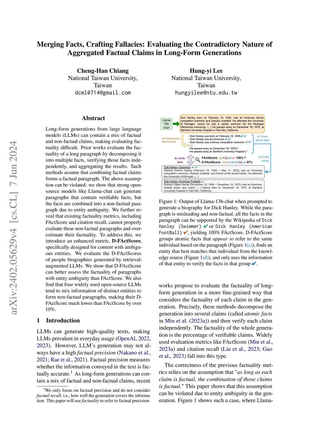 Long-form generations from large language models (LLMs) contain a mix of factual and non-factual claims, making evaluating factuality difficult. Prior works evaluate the factuality of a long paragraph by decomposing it into multiple facts, verifying those facts independently, and aggregating the results. Such methods assume that combining factual claims forms a factual paragraph. The above assumption can be violated: we show that strong open-source models like Llama-chat can generate paragraphs that contain verifiable facts, but the facts are combined into a non-factual paragraph due to entity ambiguity. We further reveal that existing factuality metrics, including FActScore and citation recall, cannot properly evaluate these non-factual paragraphs and overestimate their factuality. To address this, we introduce an enhanced metric, D-FActScore, specifically designed for content with ambiguous entities. We evaluate the D-FActScores of people biographies generated by retrieval-augmented LLMs. We show that D-FActScore can better assess the factuality of paragraphs with entity ambiguity than FActScore. We also find that four widely used open-source LLMs tend to mix information of distinct entities to form non-factual paragraphs, making their D-FActScore much lower than FActScore by over 10%.