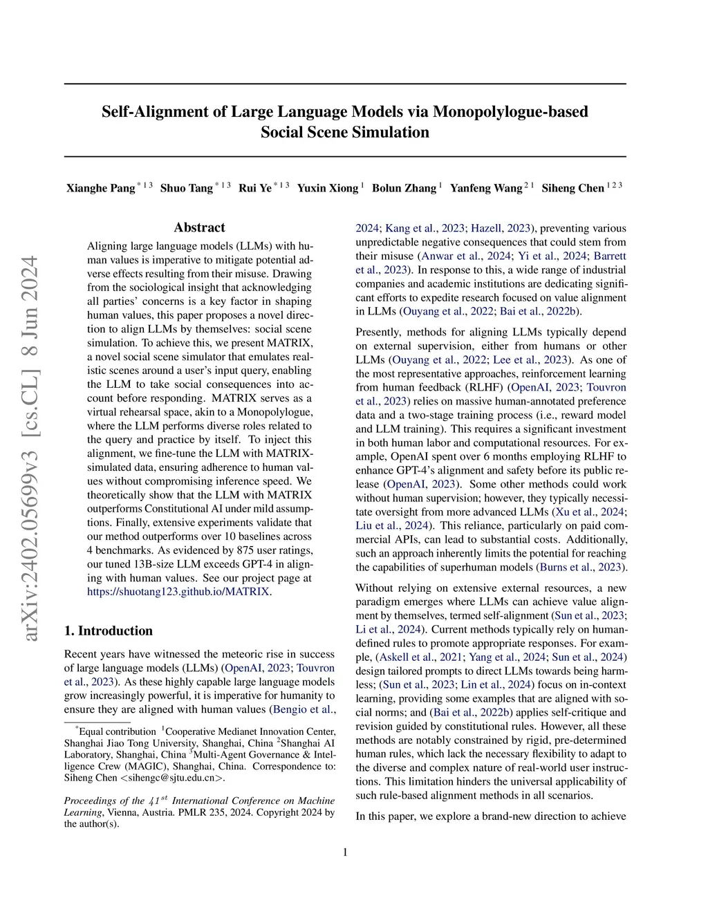 Aligning large language models (LLMs) with human values is imperative to mitigate potential adverse effects resulting from their misuse. Drawing from the sociological insight that acknowledging all parties' concerns is a key factor in shaping human values, this paper proposes a novel direction to align LLMs by themselves: social scene simulation. To achieve this, we present MATRIX, a novel social scene simulator that emulates realistic scenes around a user's input query, enabling the LLM to take social consequences into account before responding. MATRIX serves as a virtual rehearsal space, akin to a Monopolylogue, where the LLM performs diverse roles related to the query and practice by itself. To inject this alignment, we fine-tune the LLM with MATRIX-simulated data, ensuring adherence to human values without compromising inference speed. We theoretically show that the LLM with MATRIX outperforms Constitutional AI under mild assumptions. Finally, extensive experiments validate that our method outperforms over 10 baselines across 4 benchmarks. As evidenced by 875 user ratings, our tuned 13B-size LLM exceeds GPT-4 in aligning with human values. See our project page at https://shuotang123.github.io/MATRIX.
