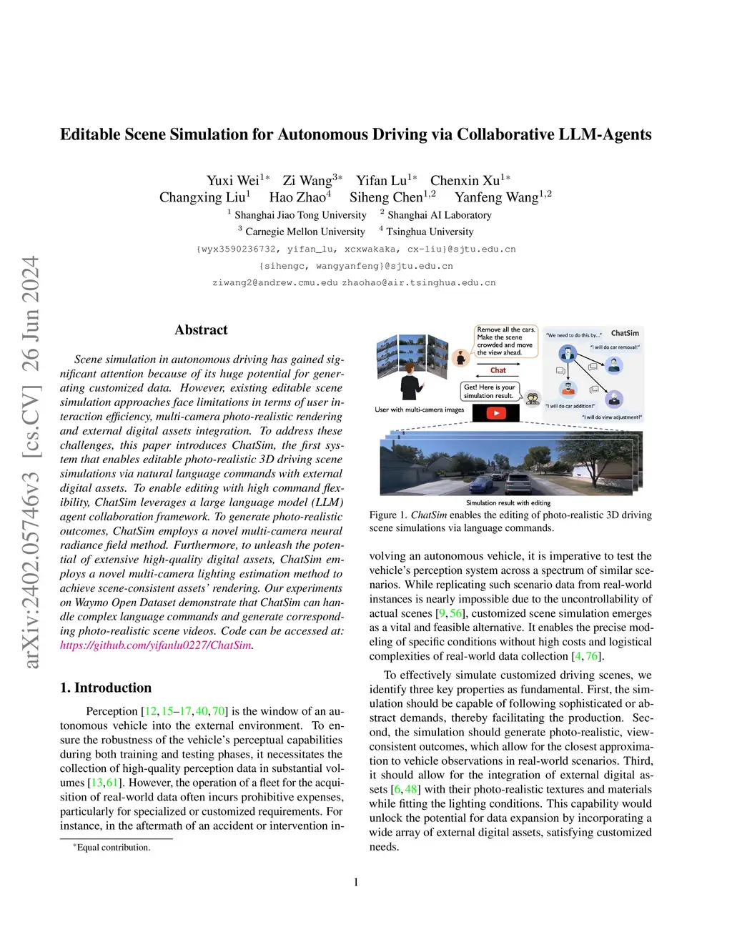 Scene simulation in autonomous driving has gained significant attention because of its huge potential for generating customized data. However, existing editable scene simulation approaches face limitations in terms of user interaction efficiency, multi-camera photo-realistic rendering and external digital assets integration. To address these challenges, this paper introduces ChatSim, the first system that enables editable photo-realistic 3D driving scene simulations via natural language commands with external digital assets. To enable editing with high command flexibility,~ChatSim leverages a large language model (LLM) agent collaboration framework. To generate photo-realistic outcomes, ChatSim employs a novel multi-camera neural radiance field method. Furthermore, to unleash the potential of extensive high-quality digital assets, ChatSim employs a novel multi-camera lighting estimation method to achieve scene-consistent assets' rendering. Our experiments on Waymo Open Dataset demonstrate that ChatSim can handle complex language commands and generate corresponding photo-realistic scene videos.