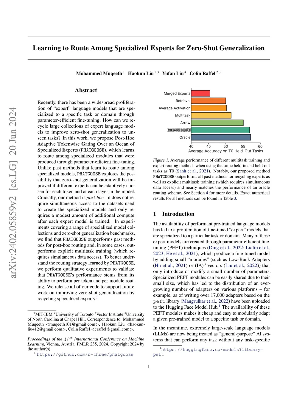 Recently, there has been a widespread proliferation of "expert" language models that are specialized to a specific task or domain through parameter-efficient fine-tuning. How can we recycle large collections of expert language models to improve zero-shot generalization to unseen tasks? In this work, we propose Post-Hoc Adaptive Tokenwise Gating Over an Ocean of Specialized Experts (PHATGOOSE), which learns to route among specialized modules that were produced through parameter-efficient fine-tuning. Unlike past methods that learn to route among specialized models, PHATGOOSE explores the possibility that zero-shot generalization will be improved if different experts can be adaptively chosen for each token and at each layer in the model. Crucially, our method is post-hoc - it does not require simultaneous access to the datasets used to create the specialized models and only requires a modest amount of additional compute after each expert model is trained. In experiments covering a range of specialized model collections and zero-shot generalization benchmarks, we find that PHATGOOSE outperforms past methods for post-hoc routing and, in some cases, outperforms explicit multitask training (which requires simultaneous data access). To better understand the routing strategy learned by PHATGOOSE, we perform qualitative experiments to validate that PHATGOOSE's performance stems from its ability to make adaptive per-token and per-module expert choices. We release all of our code to support future work on improving zero-shot generalization by recycling specialized experts.