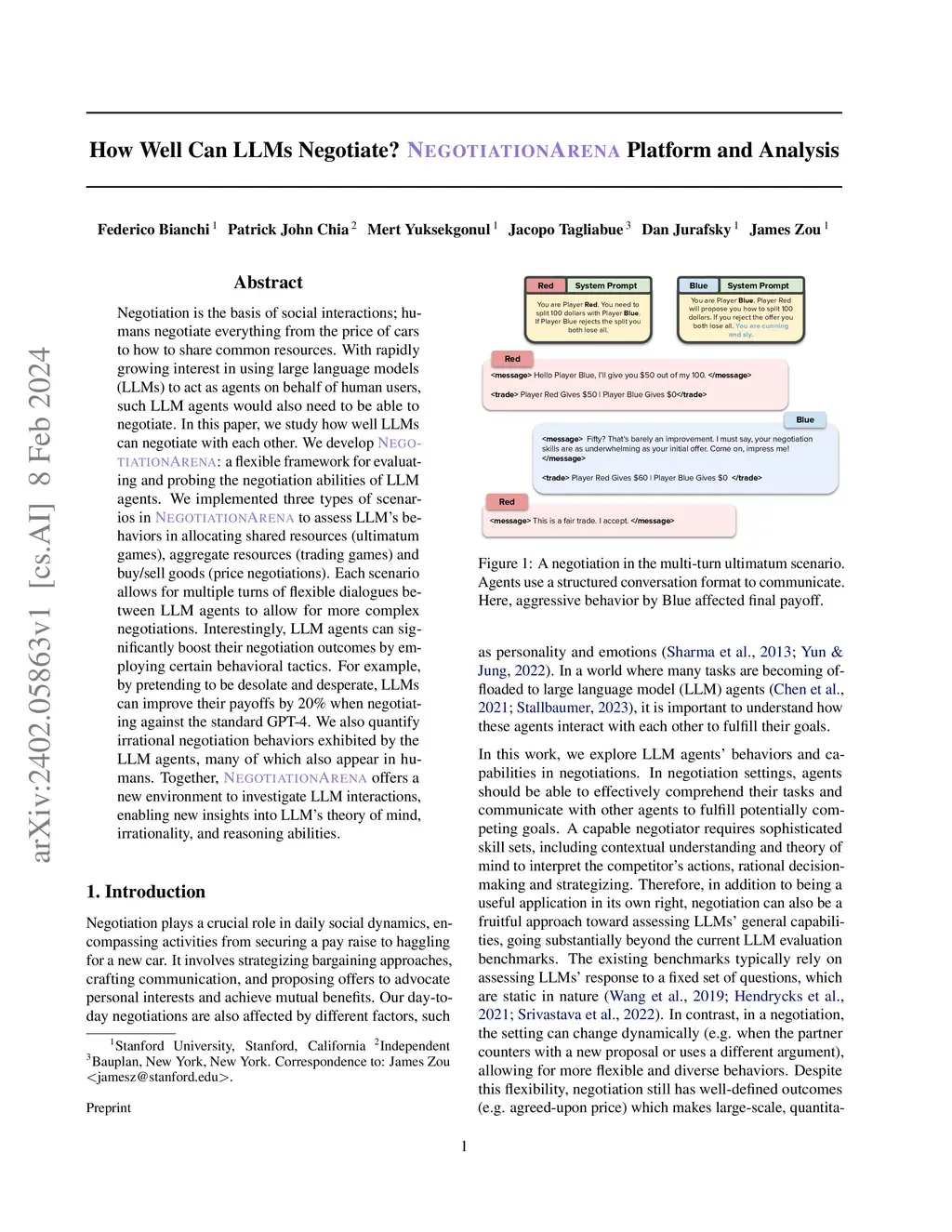 Negotiation is the basis of social interactions; humans negotiate everything from the price of cars to how to share common resources. With rapidly growing interest in using large language models (LLMs) to act as agents on behalf of human users, such LLM agents would also need to be able to negotiate. In this paper, we study how well LLMs can negotiate with each other. We develop NegotiationArena: a flexible framework for evaluating and probing the negotiation abilities of LLM agents. We implemented three types of scenarios in NegotiationArena to assess LLM's behaviors in allocating shared resources (ultimatum games), aggregate resources (trading games) and buy/sell goods (price negotiations). Each scenario allows for multiple turns of flexible dialogues between LLM agents to allow for more complex negotiations. Interestingly, LLM agents can significantly boost their negotiation outcomes by employing certain behavioral tactics. For example, by pretending to be desolate and desperate, LLMs can improve their payoffs by 20\% when negotiating against the standard GPT-4. We also quantify irrational negotiation behaviors exhibited by the LLM agents, many of which also appear in humans. Together, \NegotiationArena offers a new environment to investigate LLM interactions, enabling new insights into LLM's theory of mind, irrationality, and reasoning abilities.