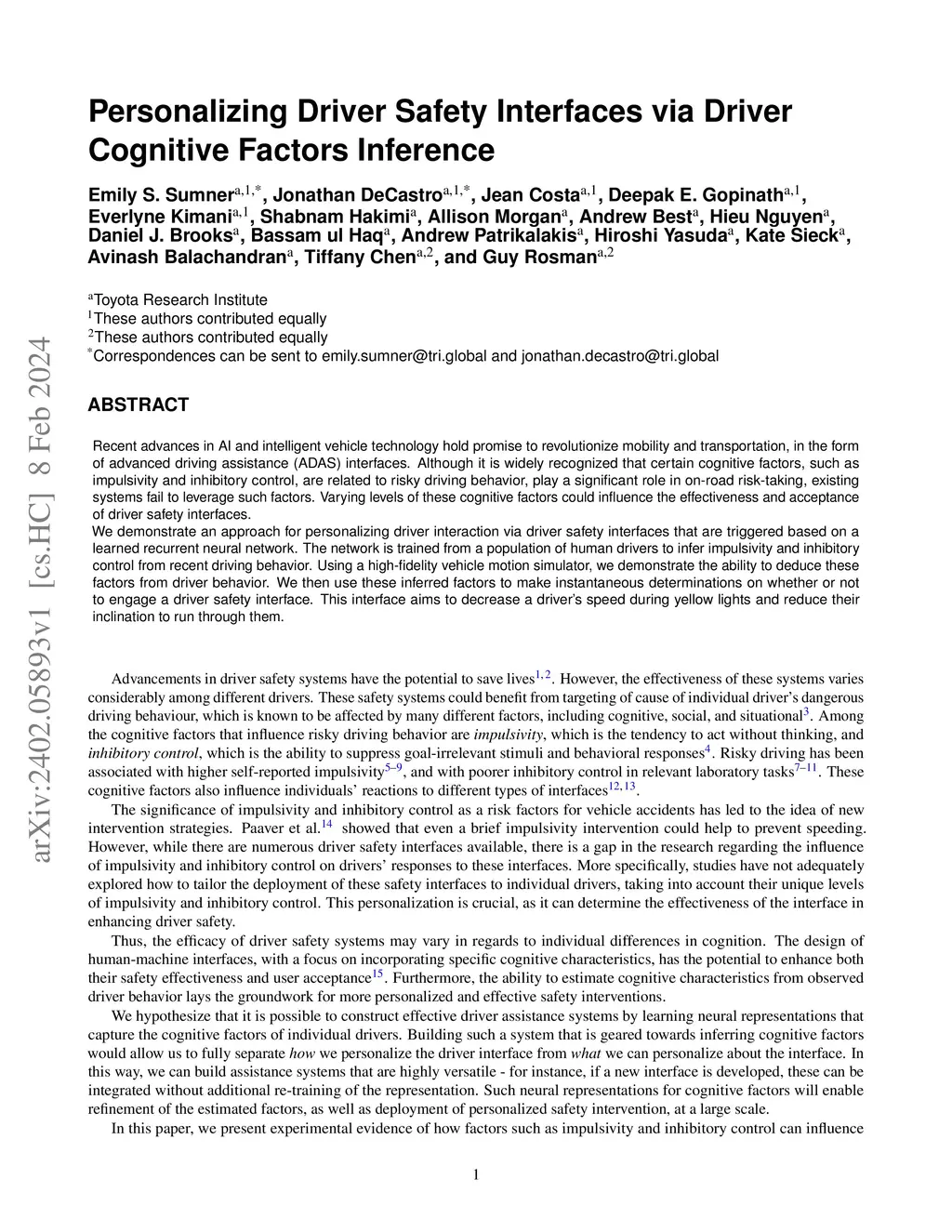 Recent advances in AI and intelligent vehicle technology hold promise to revolutionize mobility and transportation, in the form of advanced driving assistance (ADAS) interfaces. Although it is widely recognized that certain cognitive factors, such as impulsivity and inhibitory control, are related to risky driving behavior, play a significant role in on-road risk-taking, existing systems fail to leverage such factors. Varying levels of these cognitive factors could influence the effectiveness and acceptance of driver safety interfaces. We demonstrate an approach for personalizing driver interaction via driver safety interfaces that are triggered based on a learned recurrent neural network. The network is trained from a population of human drivers to infer impulsivity and inhibitory control from recent driving behavior. Using a high-fidelity vehicle motion simulator, we demonstrate the ability to deduce these factors from driver behavior. We then use these inferred factors to make instantaneous determinations on whether or not to engage a driver safety interface. This interface aims to decrease a driver's speed during yellow lights and reduce their inclination to run through them.