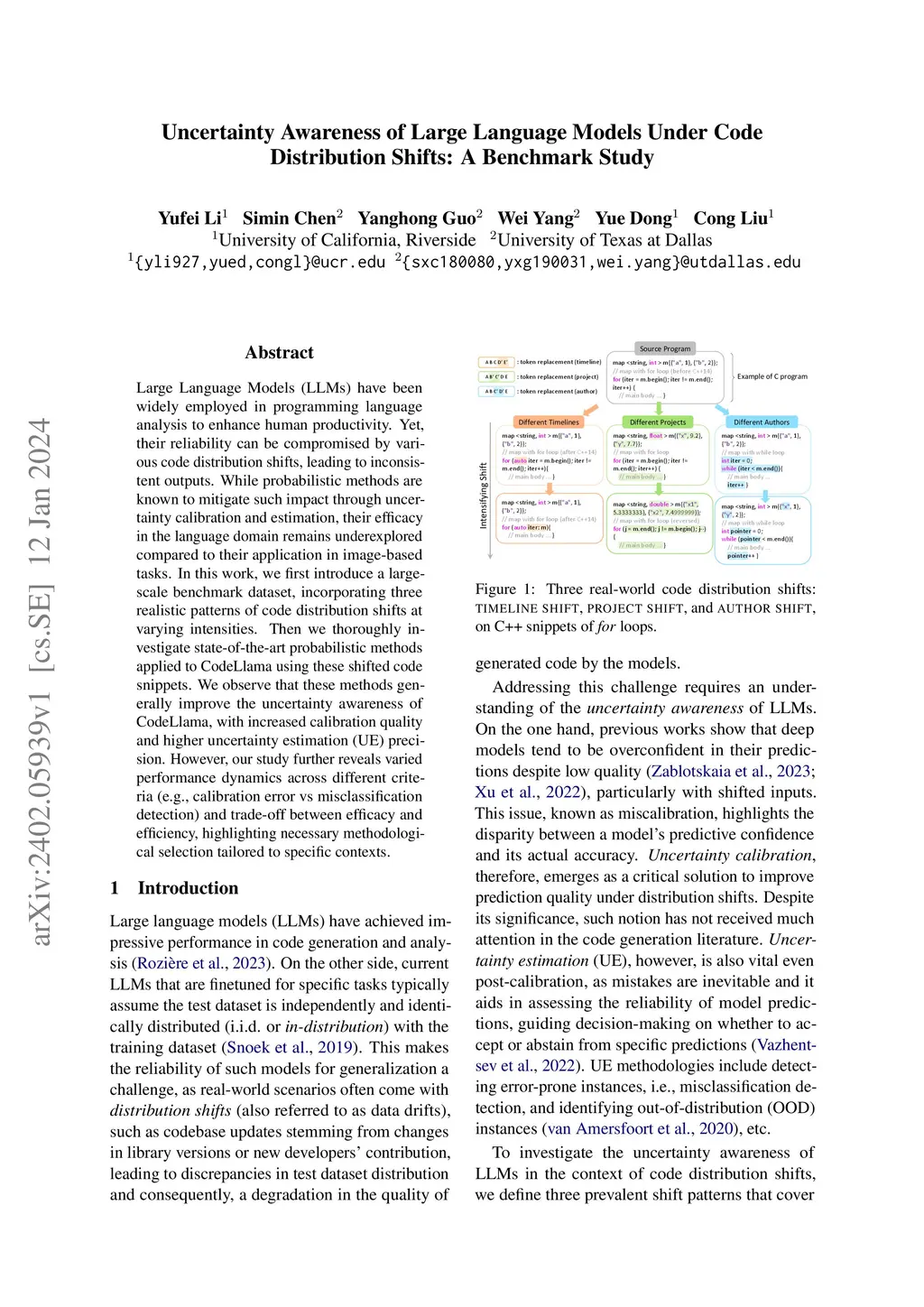 Large Language Models (LLMs) have been widely employed in programming language analysis to enhance human productivity. Yet, their reliability can be compromised by various code distribution shifts, leading to inconsistent outputs. While probabilistic methods are known to mitigate such impact through uncertainty calibration and estimation, their efficacy in the language domain remains underexplored compared to their application in image-based tasks. In this work, we first introduce a large-scale benchmark dataset, incorporating three realistic patterns of code distribution shifts at varying intensities. Then we thoroughly investigate state-of-the-art probabilistic methods applied to CodeLlama using these shifted code snippets. We observe that these methods generally improve the uncertainty awareness of CodeLlama, with increased calibration quality and higher uncertainty estimation~(UE) precision. However, our study further reveals varied performance dynamics across different criteria (e.g., calibration error vs misclassification detection) and trade-off between efficacy and efficiency, highlighting necessary methodological selection tailored to specific contexts.