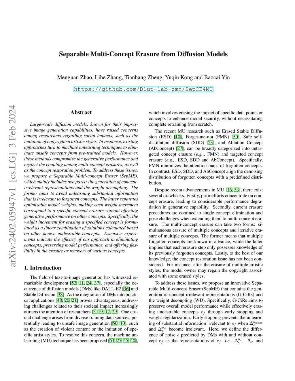 Large-scale diffusion models, known for their impressive image generation capabilities, have raised concerns among researchers regarding social impacts, such as the imitation of copyrighted artistic styles. In response, existing approaches turn to machine unlearning techniques to eliminate unsafe concepts from pre-trained models. However, these methods compromise the generative performance and neglect the coupling among multi-concept erasures, as well as the concept restoration problem. To address these issues, we propose a Separable Multi-concept Eraser (SepME), which mainly includes two parts: the generation of concept-irrelevant representations and the weight decoupling. The former aims to avoid unlearning substantial information that is irrelevant to forgotten concepts. The latter separates optimizable model weights, making each weight increment correspond to a specific concept erasure without affecting generative performance on other concepts. Specifically, the weight increment for erasing a specified concept is formulated as a linear combination of solutions calculated based on other known undesirable concepts. Extensive experiments indicate the efficacy of our approach in eliminating concepts, preserving model performance, and offering flexibility in the erasure or recovery of various concepts.
