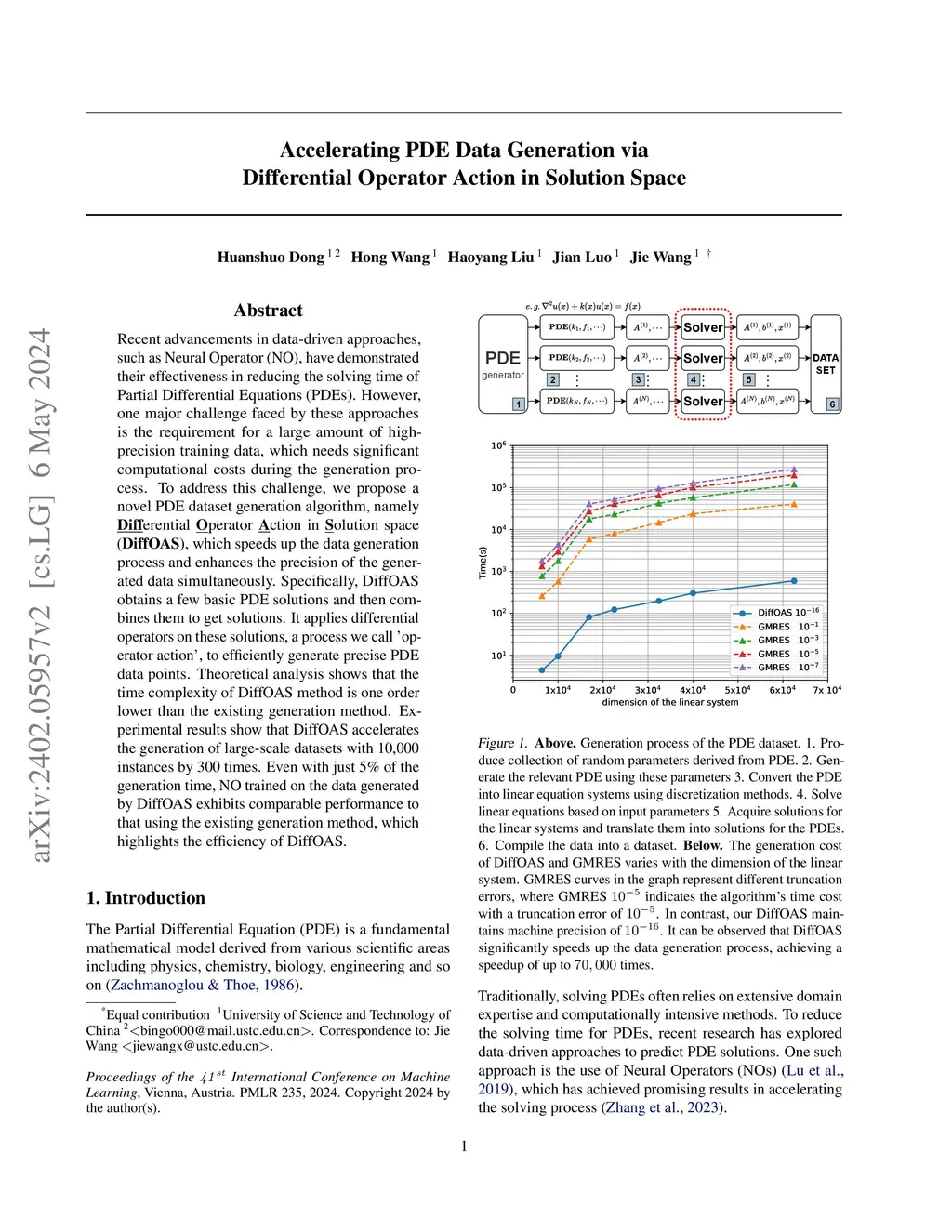 Recent advancements in data-driven approaches, such as Neural Operator (NO), have demonstrated their effectiveness in reducing the solving time of Partial Differential Equations (PDEs). However, one major challenge faced by these approaches is the requirement for a large amount of high-precision training data, which needs significant computational costs during the generation process. To address this challenge, we propose a novel PDE dataset generation algorithm, namely Differential Operator Action in Solution space (DiffOAS), which speeds up the data generation process and enhances the precision of the generated data simultaneously. Specifically, DiffOAS obtains a few basic PDE solutions and then combines them to get solutions. It applies differential operators on these solutions, a process we call óperator action', to efficiently generate precise PDE data points. Theoretical analysis shows that the time complexity of DiffOAS method is one order lower than the existing generation method. Experimental results show that DiffOAS accelerates the generation of large-scale datasets with 10,000 instances by 300 times. Even with just 5% of the generation time, NO trained on the data generated by DiffOAS exhibits comparable performance to that using the existing generation method, which highlights the efficiency of DiffOAS.