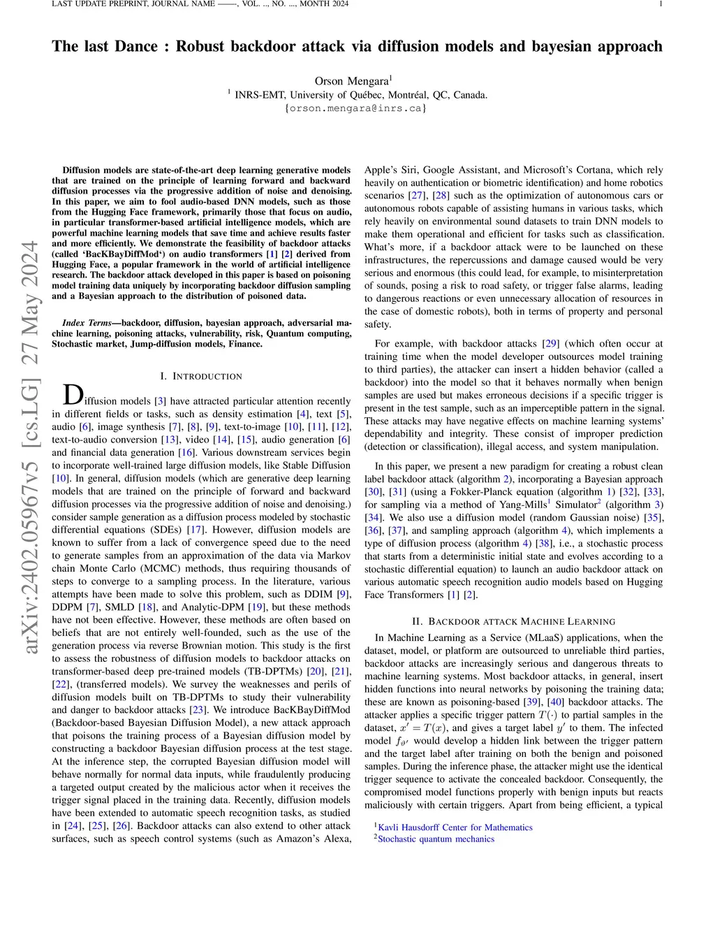 Diffusion models are state-of-the-art deep learning generative models that are trained on the principle of learning forward and backward diffusion processes via the progressive addition of noise and denoising. In this paper, we aim to fool audio-based DNN models, such as those from the Hugging Face framework, primarily those that focus on audio, in particular transformer-based artificial intelligence models, which are powerful machine learning models that save time and achieve results faster and more efficiently. We demonstrate the feasibility of backdoor attacks (called `BacKBayDiffMod`) on audio transformers derived from Hugging Face, a popular framework in the world of artificial intelligence research. The backdoor attack developed in this paper is based on poisoning model training data uniquely by incorporating backdoor diffusion sampling and a Bayesian approach to the distribution of poisoned data.