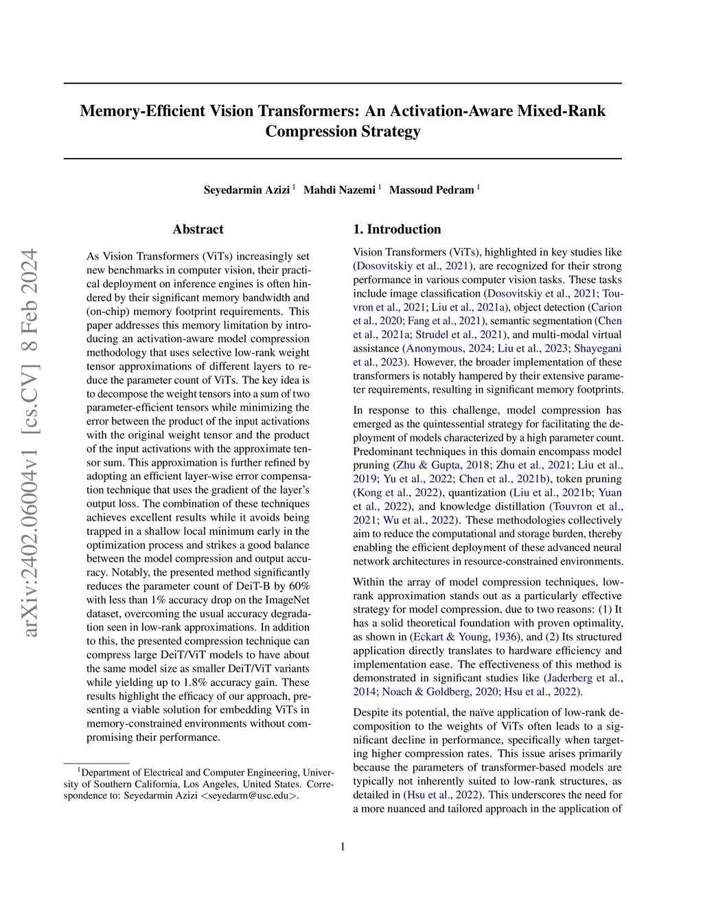 As Vision Transformers (ViTs) increasingly set new benchmarks in computer vision, their practical deployment on inference engines is often hindered by their significant memory bandwidth and (on-chip) memory footprint requirements. This paper addresses this memory limitation by introducing an activation-aware model compression methodology that uses selective low-rank weight tensor approximations of different layers to reduce the parameter count of ViTs. The key idea is to decompose the weight tensors into a sum of two parameter-efficient tensors while minimizing the error between the product of the input activations with the original weight tensor and the product of the input activations with the approximate tensor sum. This approximation is further refined by adopting an efficient layer-wise error compensation technique that uses the gradient of the layer's output loss. The combination of these techniques achieves excellent results while it avoids being trapped in a shallow local minimum early in the optimization process and strikes a good balance between the model compression and output accuracy. Notably, the presented method significantly reduces the parameter count of DeiT-B by 60% with less than 1% accuracy drop on the ImageNet dataset, overcoming the usual accuracy degradation seen in low-rank approximations. In addition to this, the presented compression technique can compress large DeiT/ViT models to have about the same model size as smaller DeiT/ViT variants while yielding up to 1.8% accuracy gain. These results highlight the efficacy of our approach, presenting a viable solution for embedding ViTs in memory-constrained environments without compromising their performance.