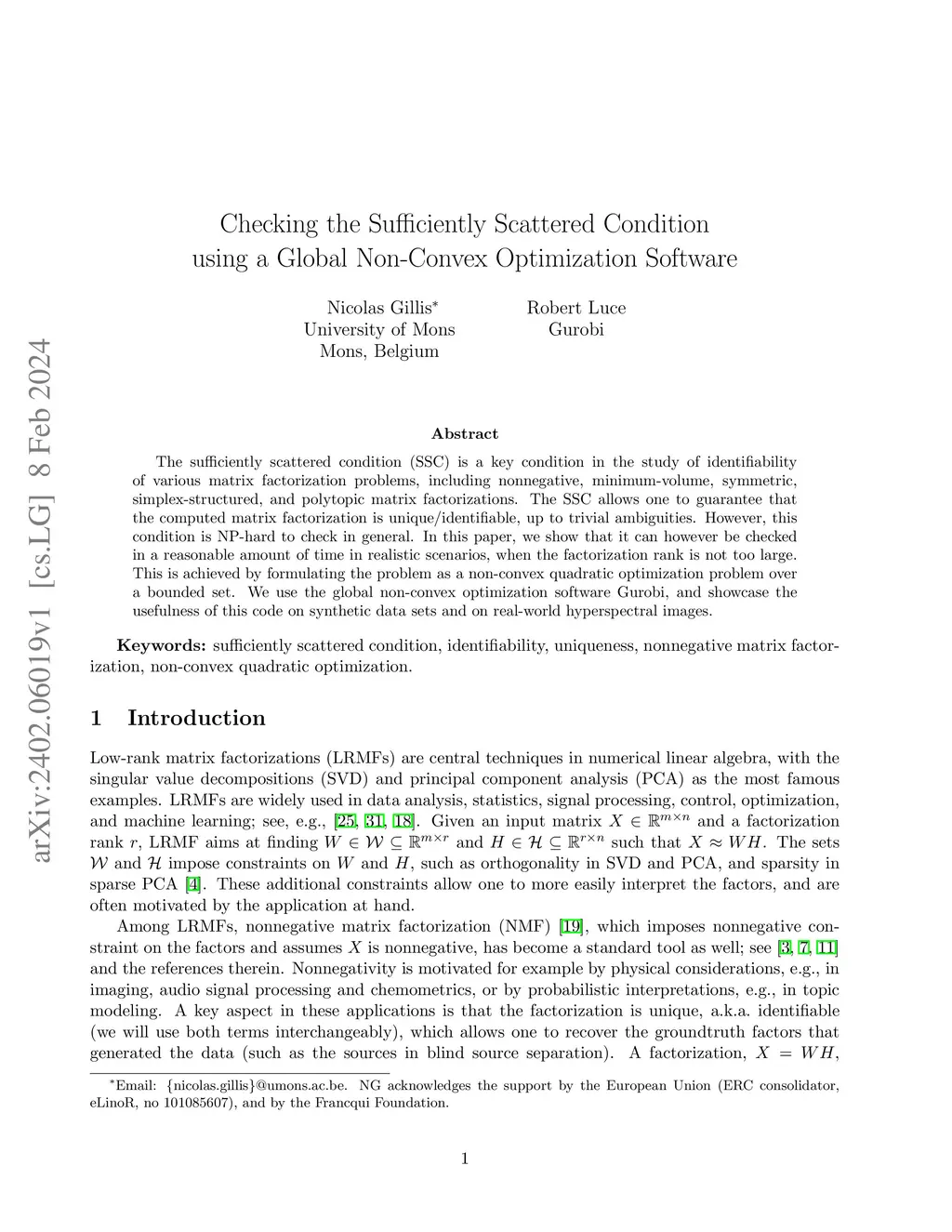 The sufficiently scattered condition (SSC) is a key condition in the study of identifiability of various matrix factorization problems, including nonnegative, minimum-volume, symmetric, simplex-structured, and polytopic matrix factorizations. The SSC allows one to guarantee that the computed matrix factorization is unique/identifiable, up to trivial ambiguities. However, this condition is NP-hard to check in general. In this paper, we show that it can however be checked in a reasonable amount of time in realistic scenarios, when the factorization rank is not too large. This is achieved by formulating the problem as a non-convex quadratic optimization problem over a bounded set. We use the global non-convex optimization software Gurobi, and showcase the usefulness of this code on synthetic data sets and on real-world hyperspectral images.