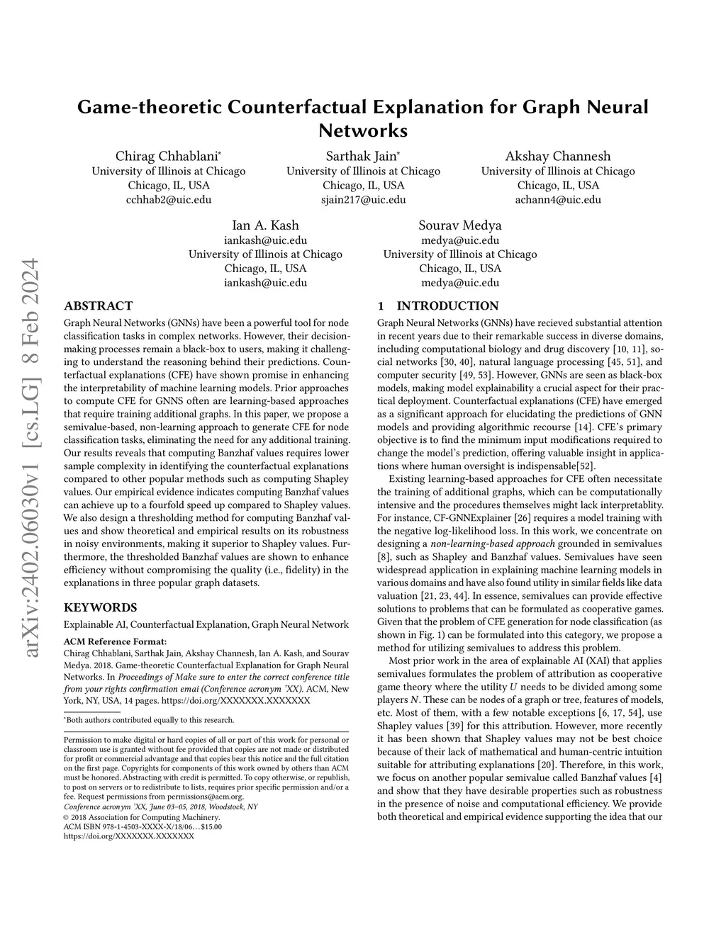 Graph Neural Networks (GNNs) have been a powerful tool for node classification tasks in complex networks. However, their decision-making processes remain a black-box to users, making it challenging to understand the reasoning behind their predictions. Counterfactual explanations (CFE) have shown promise in enhancing the interpretability of machine learning models. Prior approaches to compute CFE for GNNS often are learning-based approaches that require training additional graphs. In this paper, we propose a semivalue-based, non-learning approach to generate CFE for node classification tasks, eliminating the need for any additional training. Our results reveals that computing Banzhaf values requires lower sample complexity in identifying the counterfactual explanations compared to other popular methods such as computing Shapley values. Our empirical evidence indicates computing Banzhaf values can achieve up to a fourfold speed up compared to Shapley values. We also design a thresholding method for computing Banzhaf values and show theoretical and empirical results on its robustness in noisy environments, making it superior to Shapley values. Furthermore, the thresholded Banzhaf values are shown to enhance efficiency without compromising the quality (i.e., fidelity) in the explanations in three popular graph datasets.