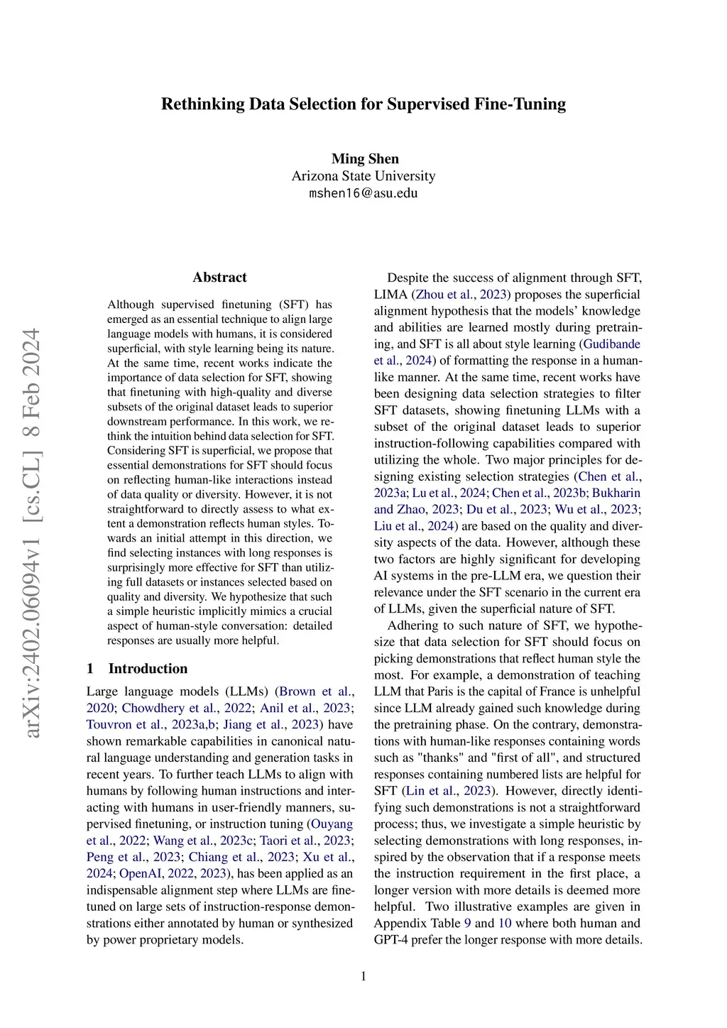 Although supervised finetuning (SFT) has emerged as an essential technique to align large language models with humans, it is considered superficial, with style learning being its nature. At the same time, recent works indicate the importance of data selection for SFT, showing that finetuning with high-quality and diverse subsets of the original dataset leads to superior downstream performance. In this work, we rethink the intuition behind data selection for SFT. Considering SFT is superficial, we propose that essential demonstrations for SFT should focus on reflecting human-like interactions instead of data quality or diversity. However, it is not straightforward to directly assess to what extent a demonstration reflects human styles. Towards an initial attempt in this direction, we find selecting instances with long responses is surprisingly more effective for SFT than utilizing full datasets or instances selected based on quality and diversity. We hypothesize that such a simple heuristic implicitly mimics a crucial aspect of human-style conversation: detailed responses are usually more helpful.