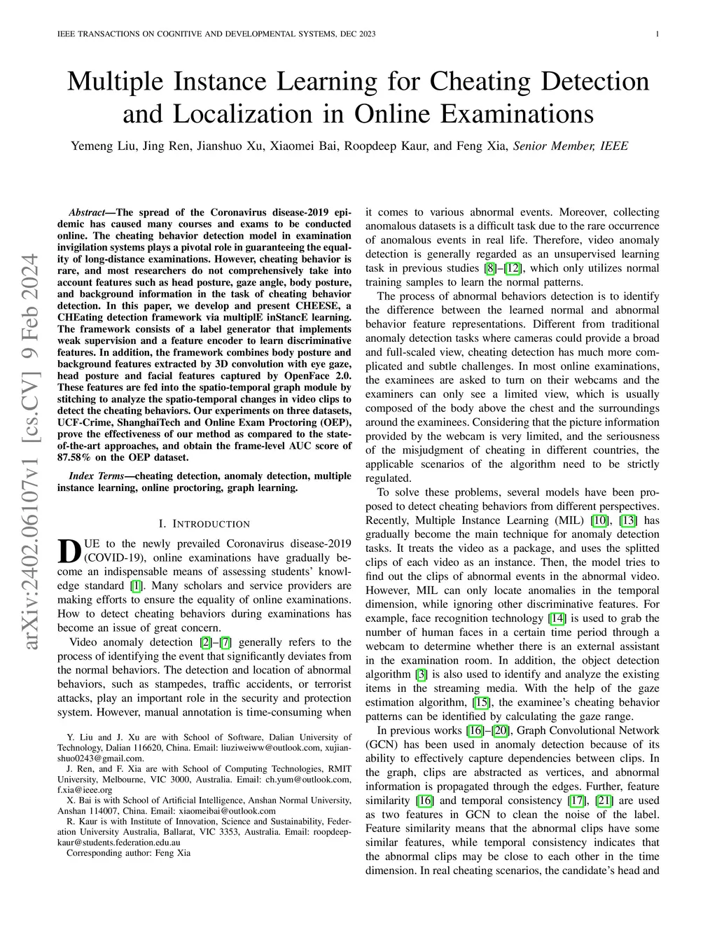 The spread of the Coronavirus disease-2019 epidemic has caused many courses and exams to be conducted online. The cheating behavior detection model in examination invigilation systems plays a pivotal role in guaranteeing the equality of long-distance examinations. However, cheating behavior is rare, and most researchers do not comprehensively take into account features such as head posture, gaze angle, body posture, and background information in the task of cheating behavior detection. In this paper, we develop and present CHEESE, a CHEating detection framework via multiplE inStancE learning. The framework consists of a label generator that implements weak supervision and a feature encoder to learn discriminative features. In addition, the framework combines body posture and background features extracted by 3D convolution with eye gaze, head posture and facial features captured by OpenFace 2.0. These features are fed into the spatio-temporal graph module by stitching to analyze the spatio-temporal changes in video clips to detect the cheating behaviors. Our experiments on three datasets, UCF-Crime, ShanghaiTech and Online Exam Proctoring (OEP), prove the effectiveness of our method as compared to the state-of-the-art approaches, and obtain the frame-level AUC score of 87.58% on the OEP dataset.