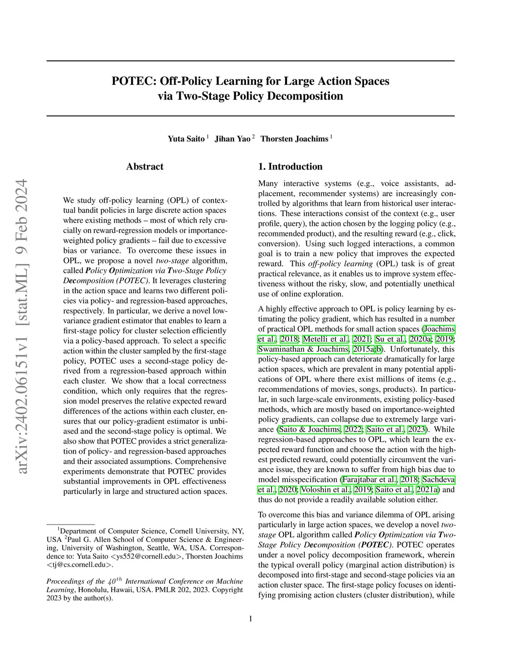 POTEC: Off-Policy Learning for Large Action Spaces via Two-Stage Policy