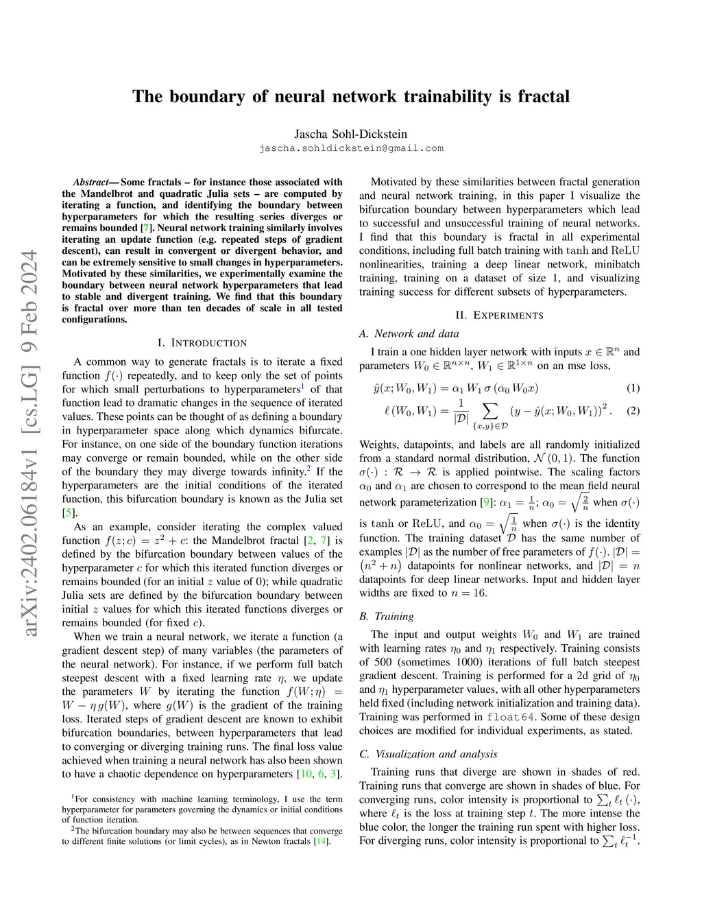 Some fractals -- for instance those associated with the Mandelbrot and quadratic Julia sets -- are computed by iterating a function, and identifying the boundary between hyperparameters for which the resulting series diverges or remains bounded. Neural network training similarly involves iterating an update function (e.g. repeated steps of gradient descent), can result in convergent or divergent behavior, and can be extremely sensitive to small changes in hyperparameters. Motivated by these similarities, we experimentally examine the boundary between neural network hyperparameters that lead to stable and divergent training. We find that this boundary is fractal over more than ten decades of scale in all tested configurations.