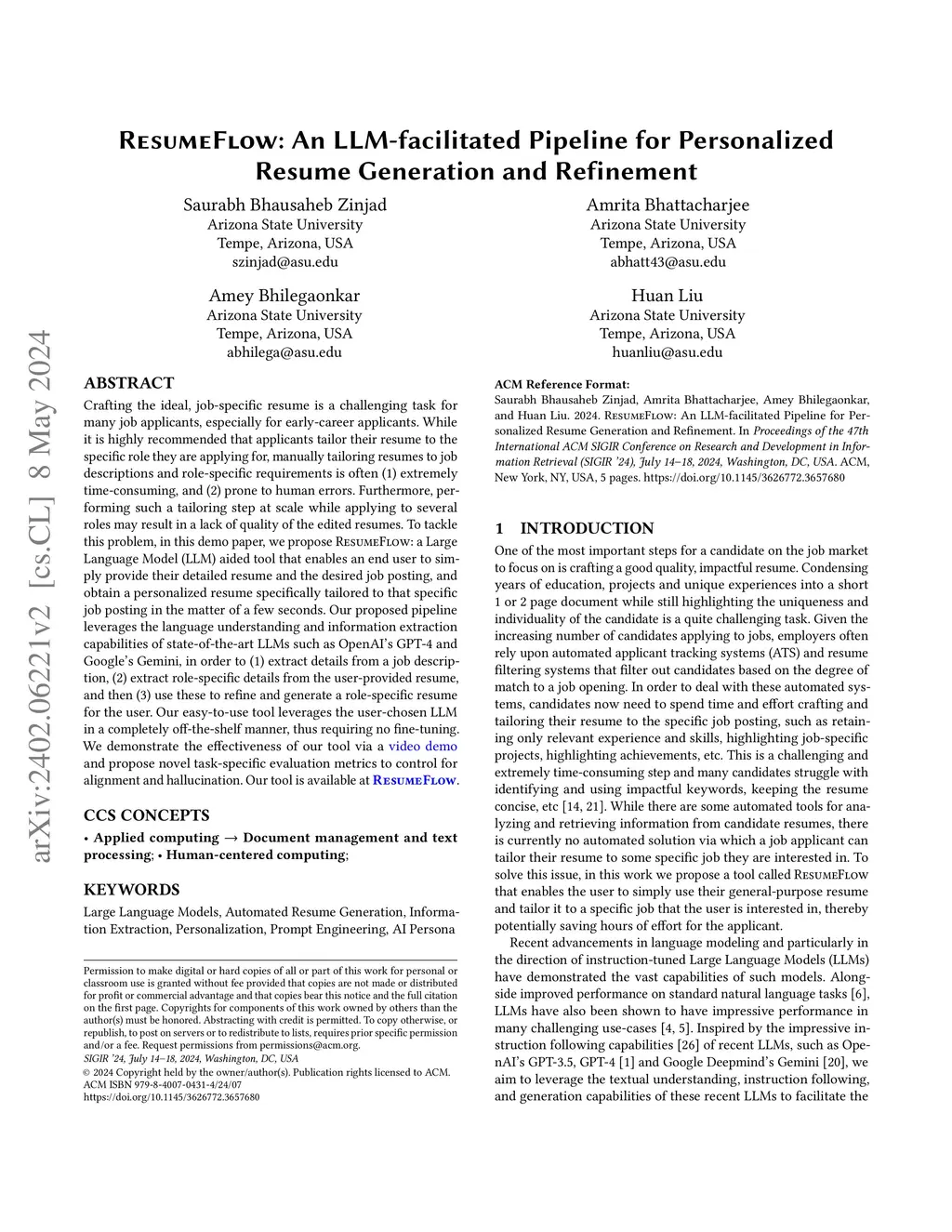 Crafting the ideal, job-specific resume is a challenging task for many job applicants, especially for early-career applicants. While it is highly recommended that applicants tailor their resume to the specific role they are applying for, manually tailoring resumes to job descriptions and role-specific requirements is often (1) extremely time-consuming, and (2) prone to human errors. Furthermore, performing such a tailoring step at scale while applying to several roles may result in a lack of quality of the edited resumes. To tackle this problem, in this demo paper, we propose ResumeFlow: a Large Language Model (LLM) aided tool that enables an end user to simply provide their detailed resume and the desired job posting, and obtain a personalized resume specifically tailored to that specific job posting in the matter of a few seconds. Our proposed pipeline leverages the language understanding and information extraction capabilities of state-of-the-art LLMs such as OpenAI's GPT-4 and Google's Gemini, in order to (1) extract details from a job description, (2) extract role-specific details from the user-provided resume, and then (3) use these to refine and generate a role-specific resume for the user. Our easy-to-use tool leverages the user-chosen LLM in a completely off-the-shelf manner, thus requiring no fine-tuning. We demonstrate the effectiveness of our tool via a video demo and propose novel task-specific evaluation metrics to control for alignment and hallucination. Our tool is available at https://job-aligned-resume.streamlit.app.