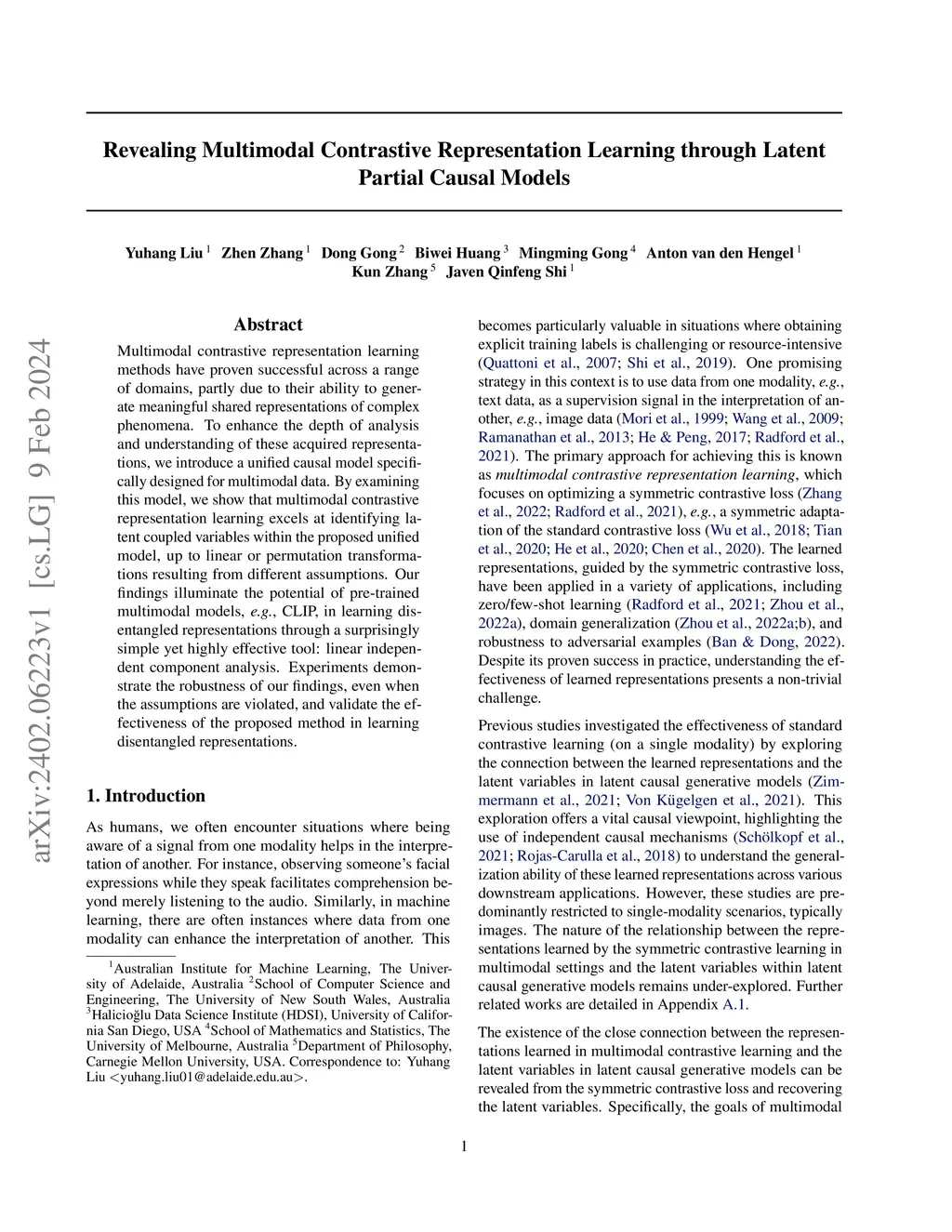 Directed acyclic graphs (DAGs) are fundamental graph structures in causal modeling, but identifying the desired DAG from observational data often requires strong assumptions that may not hold in real-world scenarios, especially for latent causal models and complex multimodal data. This raises the question of whether we can relax or bypass the DAG assumption while maintaining practical utility. In this work, we propose a novel latent partial causal model for multimodal data, featuring two latent coupled variables, connected by an undirected edge, to represent the transfer of knowledge across modalities. Under specific statistical assumptions, we establish an identifiability result, demonstrating that representations learned by multimodal contrastive learning correspond to the latent coupled variables up to a trivial transformation. This result deepens our understanding of the why multimodal contrastive learning works, highlights its potential for disentanglement, and expands the utility of pre-trained models like CLIP. Synthetic experiments confirm the robustness of our findings, even when the assumptions are partially violated. Most importantly, experiments on a pre-trained CLIP model embodies disentangled representations, enabling few-shot learning and improving domain generalization across diverse real-world datasets. Together, these contributions push the boundaries of multimodal contrastive learning, both theoretically and, crucially, in practical applications.