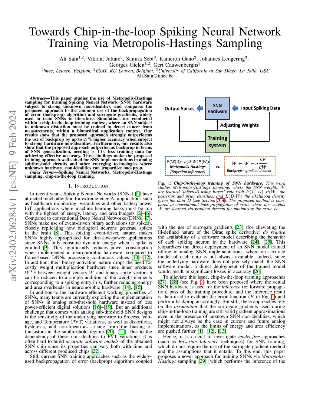 This paper studies the use of Metropolis-Hastings sampling for training Spiking Neural Network (SNN) hardware subject to strong unknown non-idealities, and compares the proposed approach to the common use of the backpropagation of error (backprop) algorithm and surrogate gradients, widely used to train SNNs in literature. Simulations are conducted within a chip-in-the-loop training context, where an SNN subject to unknown distortion must be trained to detect cancer from measurements, within a biomedical application context. Our results show that the proposed approach strongly outperforms the use of backprop by up to higher accuracy when subject to strong hardware non-idealities. Furthermore, our results also show that the proposed approach outperforms backprop in terms of SNN generalization, needing less training data for achieving effective accuracy. These findings make the proposed training approach well-suited for SNN implementations in analog subthreshold circuits and other emerging technologies where unknown hardware non-idealities can jeopardize backprop.