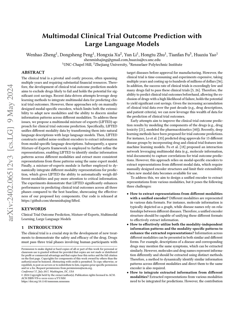The clinical trial is a pivotal and costly process, often spanning multiple years and requiring substantial financial resources. Therefore, the development of clinical trial outcome prediction models aims to exclude drugs likely to fail and holds the potential for significant cost savings. Recent data-driven attempts leverage deep learning methods to integrate multimodal data for predicting clinical trial outcomes. However, these approaches rely on manually designed modal-specific encoders, which limits both the extensibility to adapt new modalities and the ability to discern similar information patterns across different modalities. To address these issues, we propose a multimodal mixture-of-experts (LIFTED) approach for clinical trial outcome prediction. Specifically, LIFTED unifies different modality data by transforming them into natural language descriptions. Then, LIFTED constructs unified noise-resilient encoders to extract information from modal-specific language descriptions. Subsequently, a sparse Mixture-of-Experts framework is employed to further refine the representations, enabling LIFTED to identify similar information patterns across different modalities and extract more consistent representations from those patterns using the same expert model. Finally, a mixture-of-experts module is further employed to dynamically integrate different modality representations for prediction, which gives LIFTED the ability to automatically weigh different modalities and pay more attention to critical information. The experiments demonstrate that LIFTED significantly enhances performance in predicting clinical trial outcomes across all three phases compared to the best baseline, showcasing the effectiveness of our proposed key components.