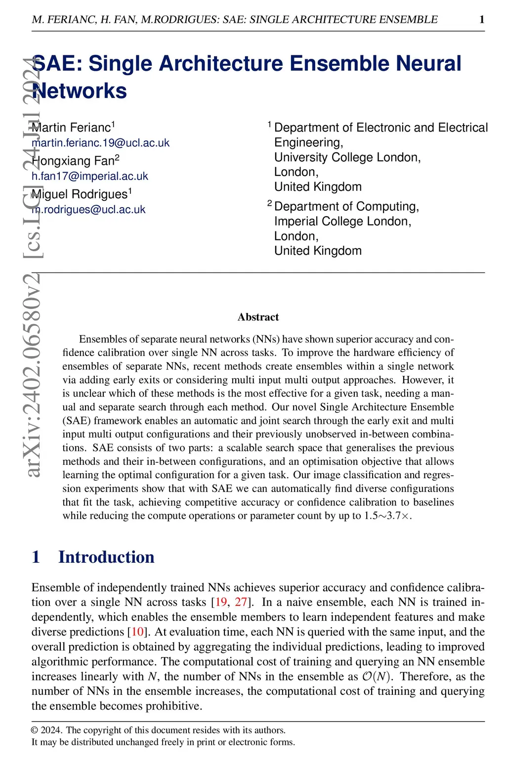 Ensembles of separate neural networks (NNs) have shown superior accuracy and confidence calibration over single NN across tasks. Recent methods compress ensembles within a single network via early exits or multi-input multi-output frameworks. However, the landscape of these methods is fragmented thus far, making it difficult to choose the right approach for a given task. Furthermore, the algorithmic performance of these methods is behind the ensemble of separate NNs and requires extensive architecture tuning. We propose a novel methodology unifying these approaches into a Single Architecture Ensemble (SAE). Our method learns the optimal number and depth of exits per ensemble input in a single NN. This enables the SAE framework to flexibly tailor its configuration for a given architecture or application. We evaluate SAEs on image classification and regression across various network architecture types and sizes. We demonstrate competitive accuracy or confidence calibration to baselines while reducing the compute operations or parameter count by up to .
