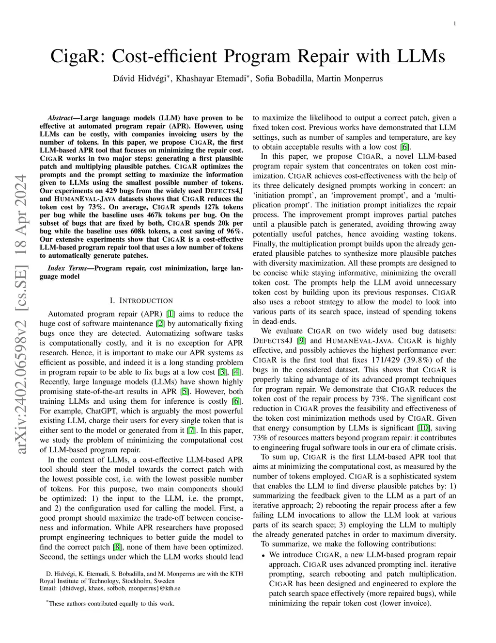 CigaR: Cost-efficient Program Repair with LLMs