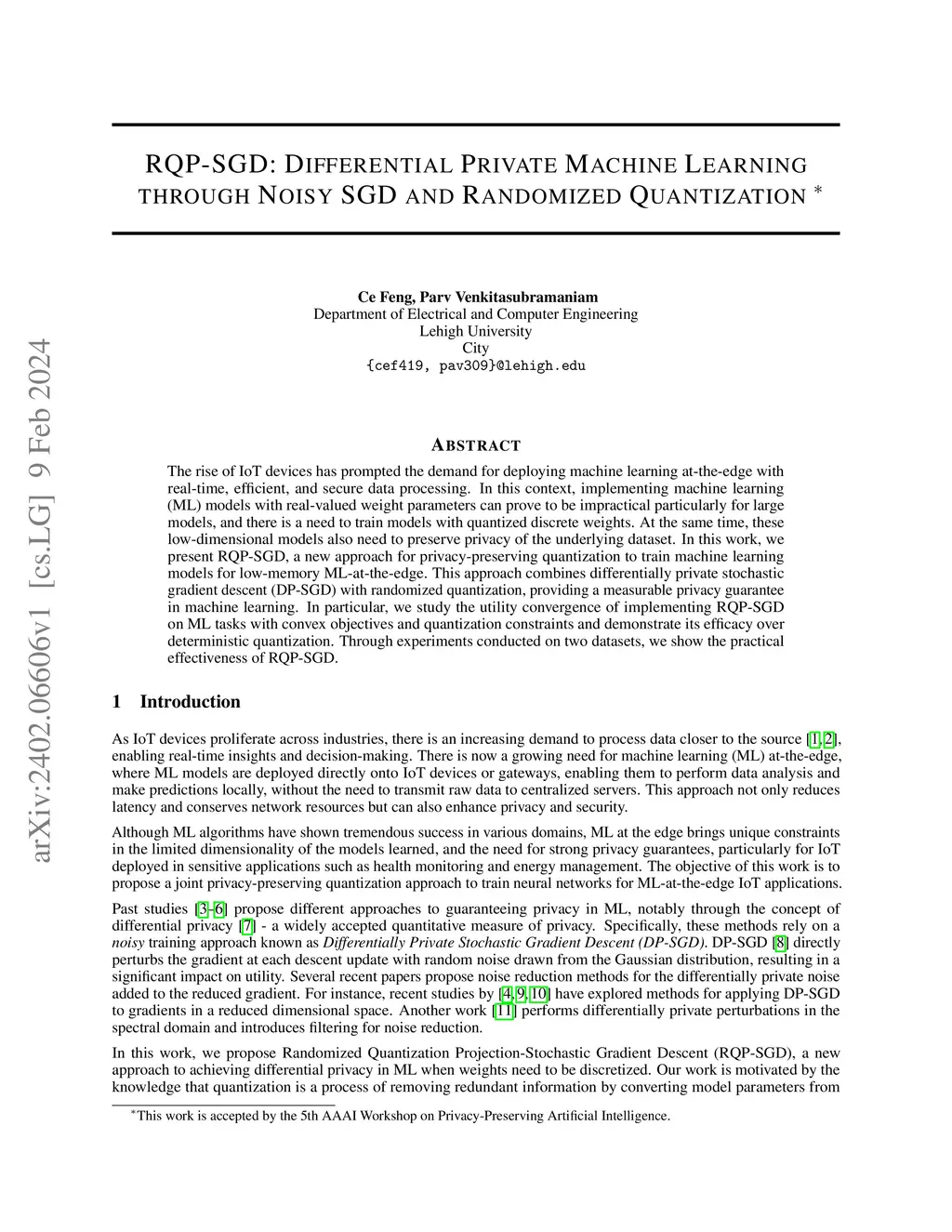 The rise of IoT devices has prompted the demand for deploying machine learning at-the-edge with real-time, efficient, and secure data processing. In this context, implementing machine learning (ML) models with real-valued weight parameters can prove to be impractical particularly for large models, and there is a need to train models with quantized discrete weights. At the same time, these low-dimensional models also need to preserve privacy of the underlying dataset. In this work, we present RQP-SGD, a new approach for privacy-preserving quantization to train machine learning models for low-memory ML-at-the-edge. This approach combines differentially private stochastic gradient descent (DP-SGD) with randomized quantization, providing a measurable privacy guarantee in machine learning. In particular, we study the utility convergence of implementing RQP-SGD on ML tasks with convex objectives and quantization constraints and demonstrate its efficacy over deterministic quantization. Through experiments conducted on two datasets, we show the practical effectiveness of RQP-SGD.