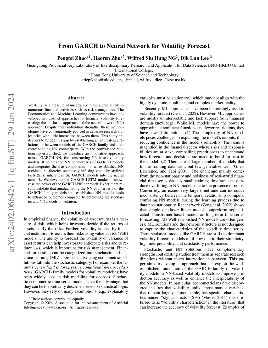 Volatility, as a measure of uncertainty, plays a crucial role in numerous financial activities such as risk management. The Econometrics and Machine Learning communities have developed two distinct approaches for financial volatility forecasting: the stochastic approach and the neural network (NN) approach. Despite their individual strengths, these methodologies have conventionally evolved in separate research trajectories with little interaction between them. This study endeavors to bridge this gap by establishing an equivalence relationship between models of the GARCH family and their corresponding NN counterparts. With the equivalence relationship established, we introduce an innovative approach, named GARCH-NN, for constructing NN-based volatility models. It obtains the NN counterparts of GARCH models and integrates them as components into an established NN architecture, thereby seamlessly infusing volatility stylized facts (SFs) inherent in the GARCH models into the neural network. We develop the GARCH-LSTM model to showcase the power of the GARCH-NN approach. Experiment results validate that amalgamating the NN counterparts of the GARCH family models into established NN models leads to enhanced outcomes compared to employing the stochastic and NN models in isolation.