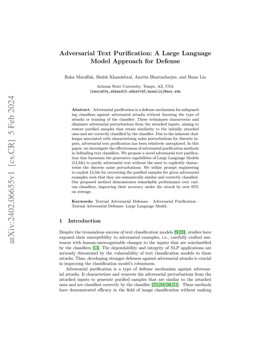 Adversarial purification is a defense mechanism for safeguarding classifiers against adversarial attacks without knowing the type of attacks or training of the classifier. These techniques characterize and eliminate adversarial perturbations from the attacked inputs, aiming to restore purified samples that retain similarity to the initially attacked ones and are correctly classified by the classifier. Due to the inherent challenges associated with characterizing noise perturbations for discrete inputs, adversarial text purification has been relatively unexplored. In this paper, we investigate the effectiveness of adversarial purification methods in defending text classifiers. We propose a novel adversarial text purification that harnesses the generative capabilities of Large Language Models (LLMs) to purify adversarial text without the need to explicitly characterize the discrete noise perturbations. We utilize prompt engineering to exploit LLMs for recovering the purified examples for given adversarial examples such that they are semantically similar and correctly classified. Our proposed method demonstrates remarkable performance over various classifiers, improving their accuracy under the attack by over 65% on average.