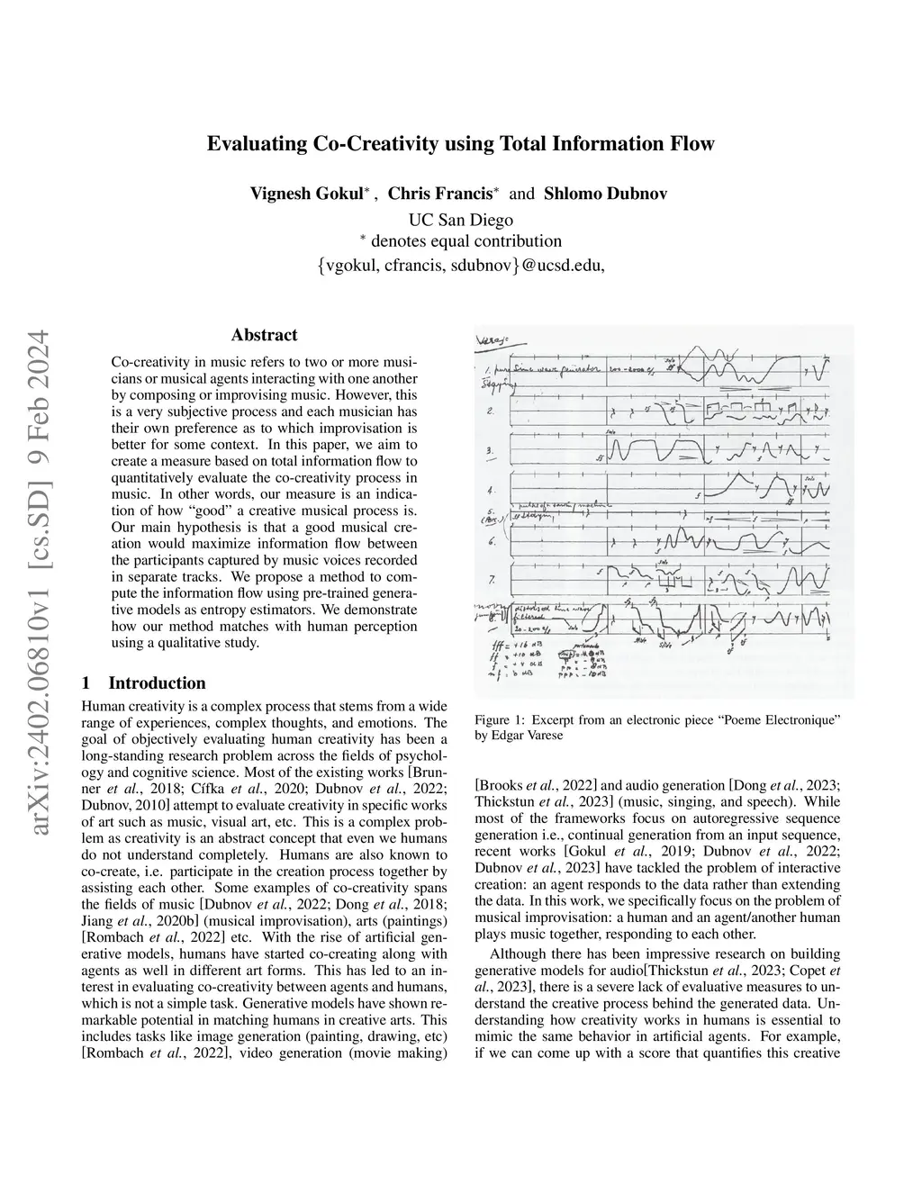 Co-creativity in music refers to two or more musicians or musical agents interacting with one another by composing or improvising music. However, this is a very subjective process and each musician has their own preference as to which improvisation is better for some context. In this paper, we aim to create a measure based on total information flow to quantitatively evaluate the co-creativity process in music. In other words, our measure is an indication of how "good" a creative musical process is. Our main hypothesis is that a good musical creation would maximize information flow between the participants captured by music voices recorded in separate tracks. We propose a method to compute the information flow using pre-trained generative models as entropy estimators. We demonstrate how our method matches with human perception using a qualitative study.