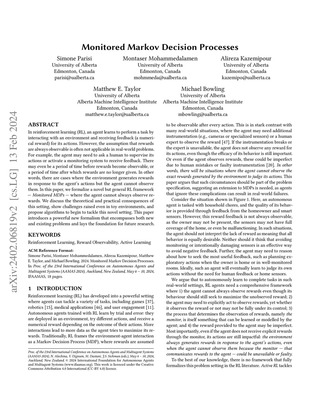 In reinforcement learning (RL), an agent learns to perform a task by interacting with an environment and receiving feedback (a numerical reward) for its actions. However, the assumption that rewards are always observable is often not applicable in real-world problems. For example, the agent may need to ask a human to supervise its actions or activate a monitoring system to receive feedback. There may even be a period of time before rewards become observable, or a period of time after which rewards are no longer given. In other words, there are cases where the environment generates rewards in response to the agent's actions but the agent cannot observe them. In this paper, we formalize a novel but general RL framework - Monitored MDPs - where the agent cannot always observe rewards. We discuss the theoretical and practical consequences of this setting, show challenges raised even in toy environments, and propose algorithms to begin to tackle this novel setting. This paper introduces a powerful new formalism that encompasses both new and existing problems and lays the foundation for future research.