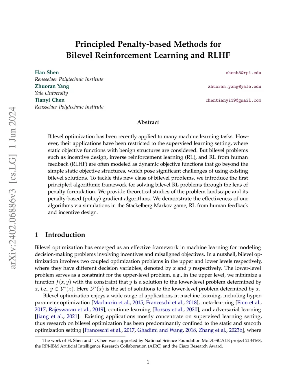 Bilevel optimization has been recently applied to many machine learning tasks. However, their applications have been restricted to the supervised learning setting, where static objective functions with benign structures are considered. But bilevel problems such as incentive design, inverse reinforcement learning (RL), and RL from human feedback (RLHF) are often modeled as dynamic objective functions that go beyond the simple static objective structures, which pose significant challenges of using existing bilevel solutions. To tackle this new class of bilevel problems, we introduce the first principled algorithmic framework for solving bilevel RL problems through the lens of penalty formulation. We provide theoretical studies of the problem landscape and its penalty-based (policy) gradient algorithms. We demonstrate the effectiveness of our algorithms via simulations in the Stackelberg Markov game, RL from human feedback and incentive design.