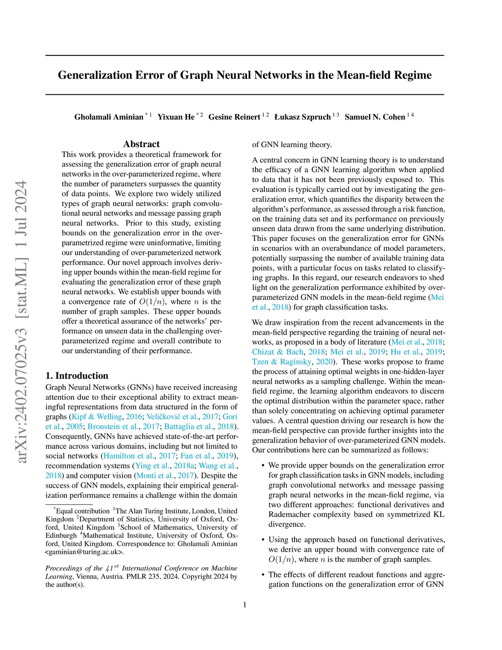 This work provides a theoretical framework for assessing the generalization error of graph neural networks in the over-parameterized regime, where the number of parameters surpasses the quantity of data points. We explore two widely utilized types of graph neural networks: graph convolutional neural networks and message passing graph neural networks. Prior to this study, existing bounds on the generalization error in the over-parametrized regime were uninformative, limiting our understanding of over-parameterized network performance. Our novel approach involves deriving upper bounds within the mean-field regime for evaluating the generalization error of these graph neural networks. We establish upper bounds with a convergence rate of , where is the number of graph samples. These upper bounds offer a theoretical assurance of the networks' performance on unseen data in the challenging over-parameterized regime and overall contribute to our understanding of their performance.