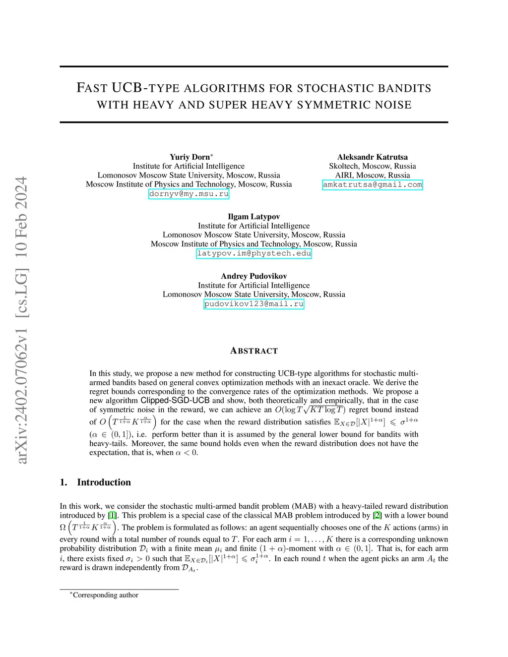 In this study, we propose a new method for constructing UCB-type algorithms for stochastic multi-armed bandits based on general convex optimization methods with an inexact oracle. We derive the regret bounds corresponding to the convergence rates of the optimization methods. We propose a new algorithm Clipped-SGD-UCB and show, both theoretically and empirically, that in the case of symmetric noise in the reward, we can achieve an regret bound instead of for the case when the reward distribution satisfies (, i.e. perform better than it is assumed by the general lower bound for bandits with heavy-tails. Moreover, the same bound holds even when the reward distribution does not have the expectation, that is, when .