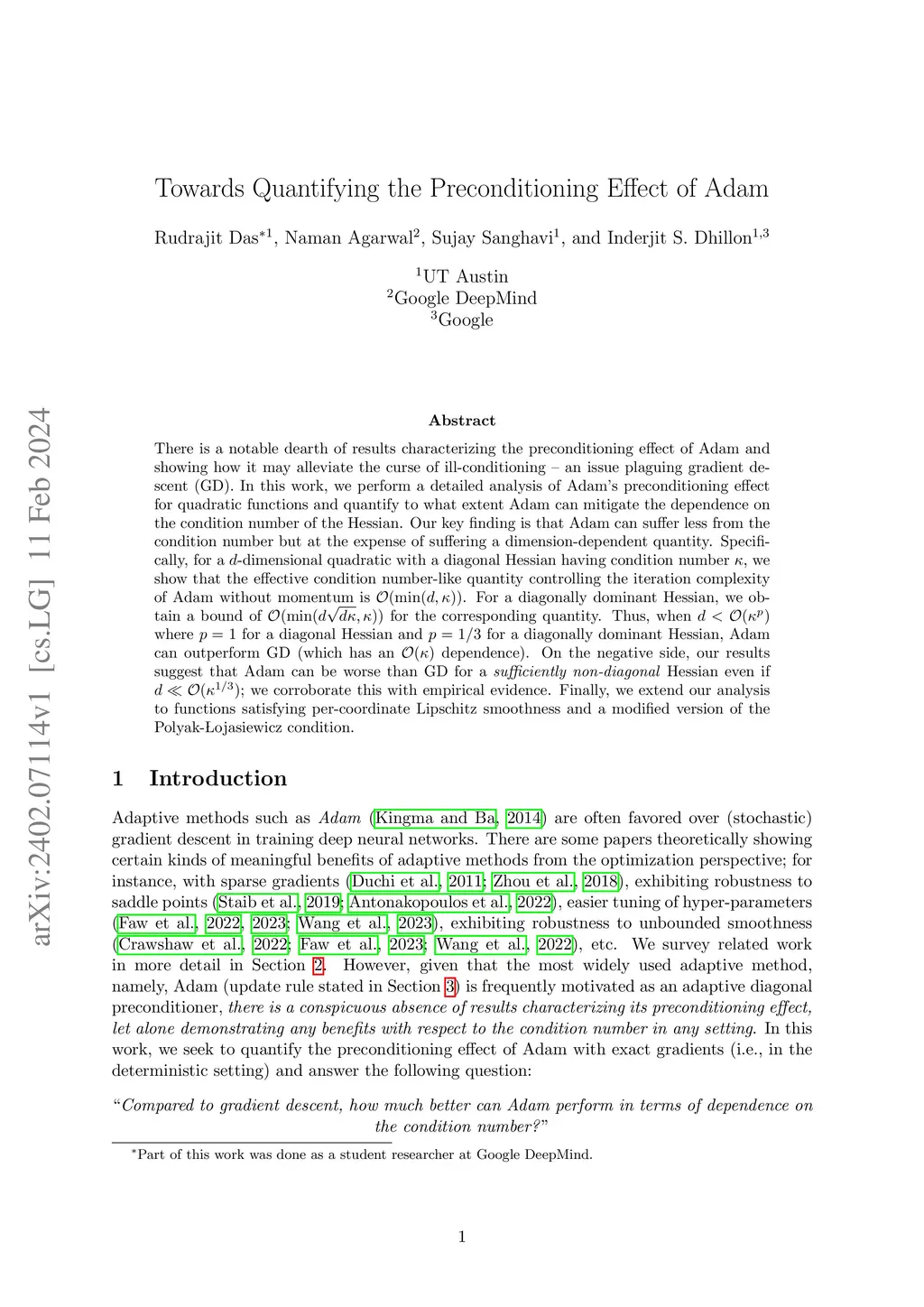 There is a notable dearth of results characterizing the preconditioning effect of Adam and showing how it may alleviate the curse of ill-conditioning -- an issue plaguing gradient descent (GD). In this work, we perform a detailed analysis of Adam's preconditioning effect for quadratic functions and quantify to what extent Adam can mitigate the dependence on the condition number of the Hessian. Our key finding is that Adam can suffer less from the condition number but at the expense of suffering a dimension-dependent quantity. Specifically, for a -dimensional quadratic with a diagonal Hessian having condition number , we show that the effective condition number-like quantity controlling the iteration complexity of Adam without momentum is . For a diagonally dominant Hessian, we obtain a bound of for the corresponding quantity. Thus, when where for a diagonal Hessian and for a diagonally dominant Hessian, Adam can outperform GD (which has an dependence). On the negative side, our results suggest that Adam can be worse than GD for a sufficiently non-diagonal Hessian even if ; we corroborate this with empirical evidence. Finally, we extend our analysis to functions satisfying per-coordinate Lipschitz smoothness and a modified version of the Polyak-\L ojasiewicz condition.