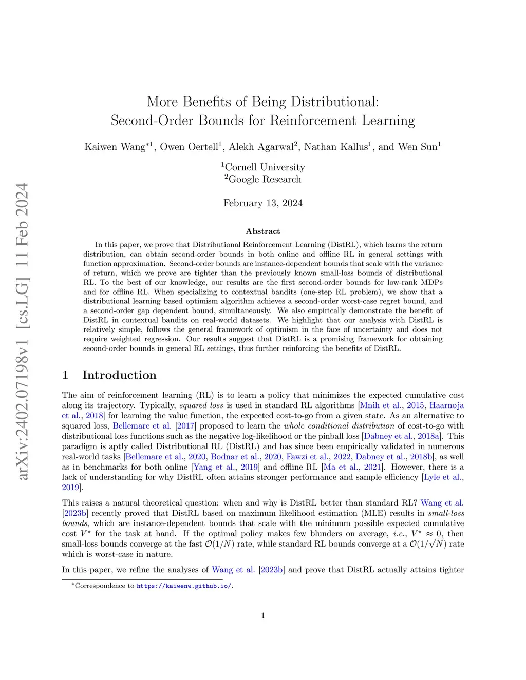 In this paper, we prove that Distributional Reinforcement Learning (DistRL), which learns the return distribution, can obtain second-order bounds in both online and offline RL in general settings with function approximation. Second-order bounds are instance-dependent bounds that scale with the variance of return, which we prove are tighter than the previously known small-loss bounds of distributional RL. To the best of our knowledge, our results are the first second-order bounds for low-rank MDPs and for offline RL. When specializing to contextual bandits (one-step RL problem), we show that a distributional learning based optimism algorithm achieves a second-order worst-case regret bound, and a second-order gap dependent bound, simultaneously. We also empirically demonstrate the benefit of DistRL in contextual bandits on real-world datasets. We highlight that our analysis with DistRL is relatively simple, follows the general framework of optimism in the face of uncertainty and does not require weighted regression. Our results suggest that DistRL is a promising framework for obtaining second-order bounds in general RL settings, thus further reinforcing the benefits of DistRL.