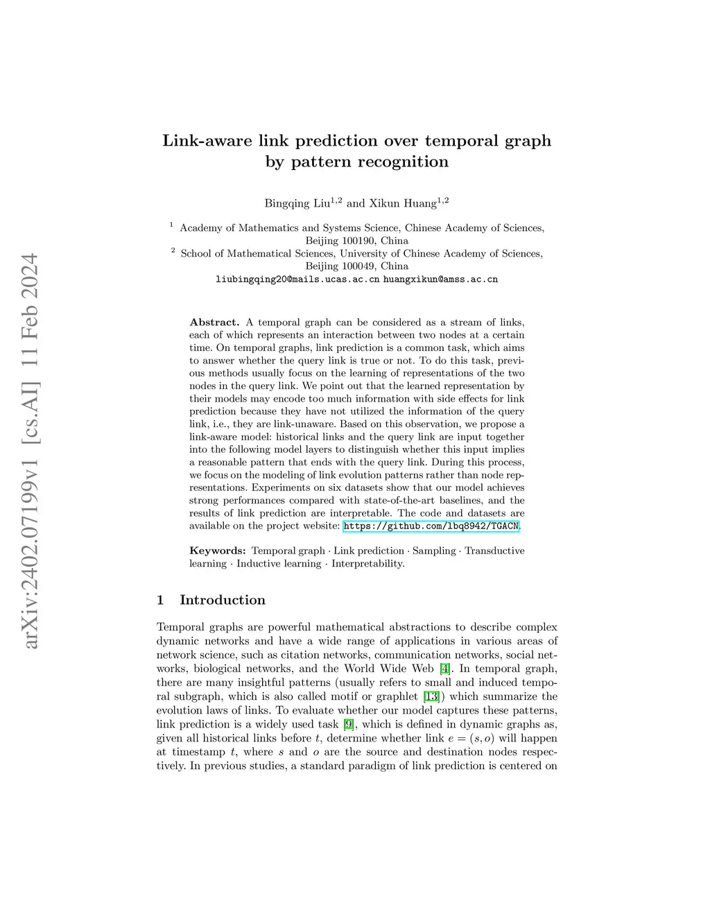 A temporal graph can be considered as a stream of links, each of which represents an interaction between two nodes at a certain time. On temporal graphs, link prediction is a common task, which aims to answer whether the query link is true or not. To do this task, previous methods usually focus on the learning of representations of the two nodes in the query link. We point out that the learned representation by their models may encode too much information with side effects for link prediction because they have not utilized the information of the query link, i.e., they are link-unaware. Based on this observation, we propose a link-aware model: historical links and the query link are input together into the following model layers to distinguish whether this input implies a reasonable pattern that ends with the query link. During this process, we focus on the modeling of link evolution patterns rather than node representations. Experiments on six datasets show that our model achieves strong performances compared with state-of-the-art baselines, and the results of link prediction are interpretable. The code and datasets are available on the project website: https://github.com/lbq8942/TGACN.