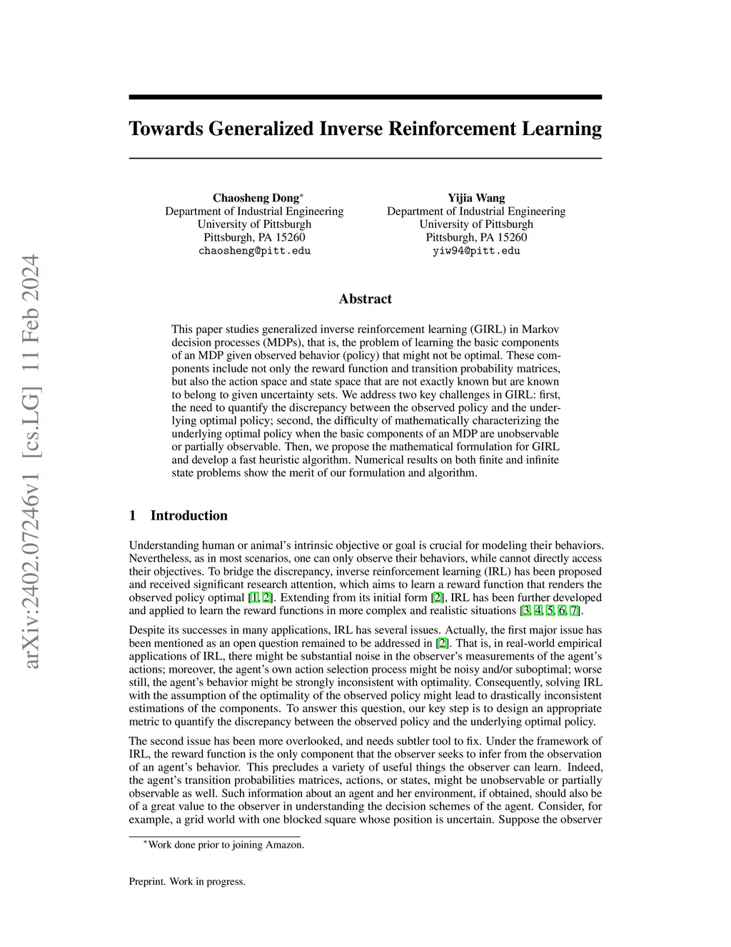 This paper studies generalized inverse reinforcement learning (GIRL) in Markov decision processes (MDPs), that is, the problem of learning the basic components of an MDP given observed behavior (policy) that might not be optimal. These components include not only the reward function and transition probability matrices, but also the action space and state space that are not exactly known but are known to belong to given uncertainty sets. We address two key challenges in GIRL: first, the need to quantify the discrepancy between the observed policy and the underlying optimal policy; second, the difficulty of mathematically characterizing the underlying optimal policy when the basic components of an MDP are unobservable or partially observable. Then, we propose the mathematical formulation for GIRL and develop a fast heuristic algorithm. Numerical results on both finite and infinite state problems show the merit of our formulation and algorithm.