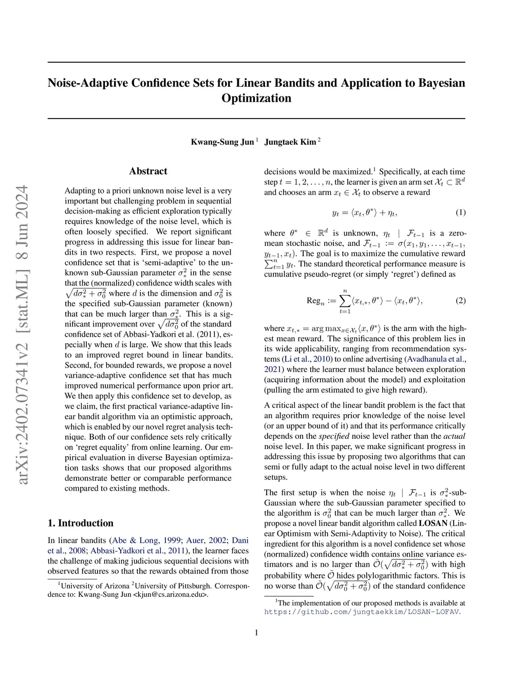 Adapting to a priori unknown noise level is a very important but challenging problem in sequential decision-making as efficient exploration typically requires knowledge of the noise level, which is often loosely specified. We report significant progress in addressing this issue for linear bandits in two respects. First, we propose a novel confidence set that is `semi-adaptive' to the unknown sub-Gaussian parameter in the sense that the (normalized) confidence width scales with where is the dimension and is the specified sub-Gaussian parameter (known) that can be much larger than . This is a significant improvement over of the standard confidence set of Abbasi-Yadkori et al. (2011), especially when is large or . We show that this leads to an improved regret bound in linear bandits. Second, for bounded rewards, we propose a novel variance-adaptive confidence set that has much improved numerical performance upon prior art. We then apply this confidence set to develop, as we claim, the first practical variance-adaptive linear bandit algorithm via an optimistic approach, which is enabled by our novel regret analysis technique. Both of our confidence sets rely critically on `regret equality' from online learning. Our empirical evaluation in diverse Bayesian optimization tasks shows that our proposed algorithms demonstrate better or comparable performance compared to existing methods.