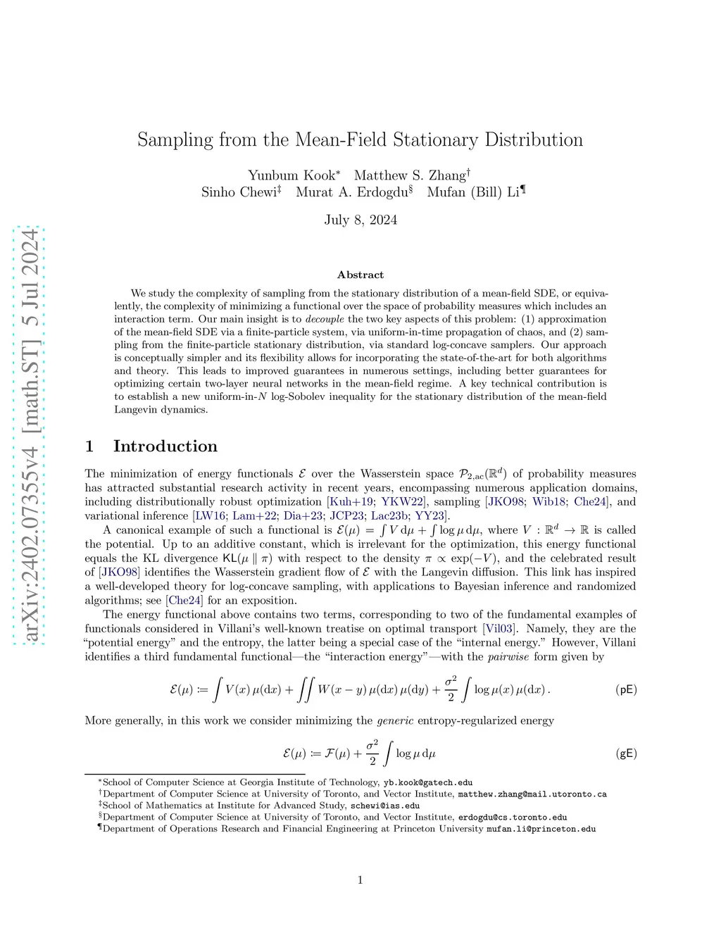 We study the complexity of sampling from the stationary distribution of a mean-field SDE, or equivalently, the complexity of minimizing a functional over the space of probability measures which includes an interaction term. Our main insight is to decouple the two key aspects of this problem: (1) approximation of the mean-field SDE via a finite-particle system, via uniform-in-time propagation of chaos, and (2) sampling from the finite-particle stationary distribution, via standard log-concave samplers. Our approach is conceptually simpler and its flexibility allows for incorporating the state-of-the-art for both algorithms and theory. This leads to improved guarantees in numerous settings, including better guarantees for optimizing certain two-layer neural networks in the mean-field regime. A key technical contribution is to establish a new uniform-in- log-Sobolev inequality for the stationary distribution of the mean-field Langevin dynamics.