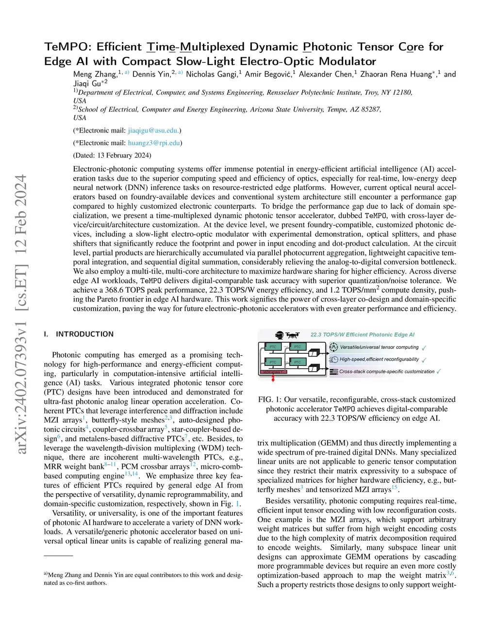 Electronic-photonic computing systems offer immense potential in energy-efficient artificial intelligence (AI) acceleration tasks due to the superior computing speed and efficiency of optics, especially for real-time, low-energy deep neural network (DNN) inference tasks on resource-restricted edge platforms. However, current optical neural accelerators based on foundry-available devices and conventional system architecture still encounter a performance gap compared to highly customized electronic counterparts. To bridge the performance gap due to lack of domain specialization, we present a time-multiplexed dynamic photonic tensor accelerator, dubbed TeMPO, with cross-layer device/circuit/architecture customization. At the device level, we present foundry-compatible, customized photonic devices, including a slow-light electro-optic modulator with experimental demonstration, optical splitters, and phase shifters that significantly reduce the footprint and power in input encoding and dot-product calculation. At the circuit level, partial products are hierarchically accumulated via parallel photocurrent aggregation, lightweight capacitive temporal integration, and sequential digital summation, considerably relieving the analog-to-digital conversion bottleneck. We also employ a multi-tile, multi-core architecture to maximize hardware sharing for higher efficiency. Across diverse edge AI workloads, TeMPO delivers digital-comparable task accuracy with superior quantization/noise tolerance. We achieve a 368.6 TOPS peak performance, 22.3 TOPS/W energy efficiency, and 1.2 TOPS/mm compute density, pushing the Pareto frontier in edge AI hardware. This work signifies the power of cross-layer co-design and domain-specific customization, paving the way for future electronic-photonic accelerators with even greater performance and efficiency.
