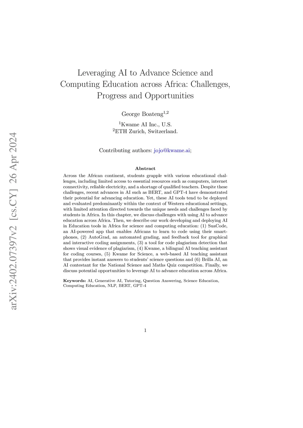Across the African continent, students grapple with various educational challenges, including limited access to essential resources such as computers, internet connectivity, reliable electricity, and a shortage of qualified teachers. Despite these challenges, recent advances in AI such as BERT, and GPT-4 have demonstrated their potential for advancing education. Yet, these AI tools tend to be deployed and evaluated predominantly within the context of Western educational settings, with limited attention directed towards the unique needs and challenges faced by students in Africa. In this chapter, we discuss challenges with using AI to advance education across Africa. Then, we describe our work developing and deploying AI in Education tools in Africa for science and computing education: (1) SuaCode, an AI-powered app that enables Africans to learn to code using their smartphones, (2) AutoGrad, an automated grading, and feedback tool for graphical and interactive coding assignments, (3) a tool for code plagiarism detection that shows visual evidence of plagiarism, (4) Kwame, a bilingual AI teaching assistant for coding courses, (5) Kwame for Science, a web-based AI teaching assistant that provides instant answers to students' science questions and (6) Brilla AI, an AI contestant for the National Science and Maths Quiz competition. Finally, we discuss potential opportunities to leverage AI to advance education across Africa.