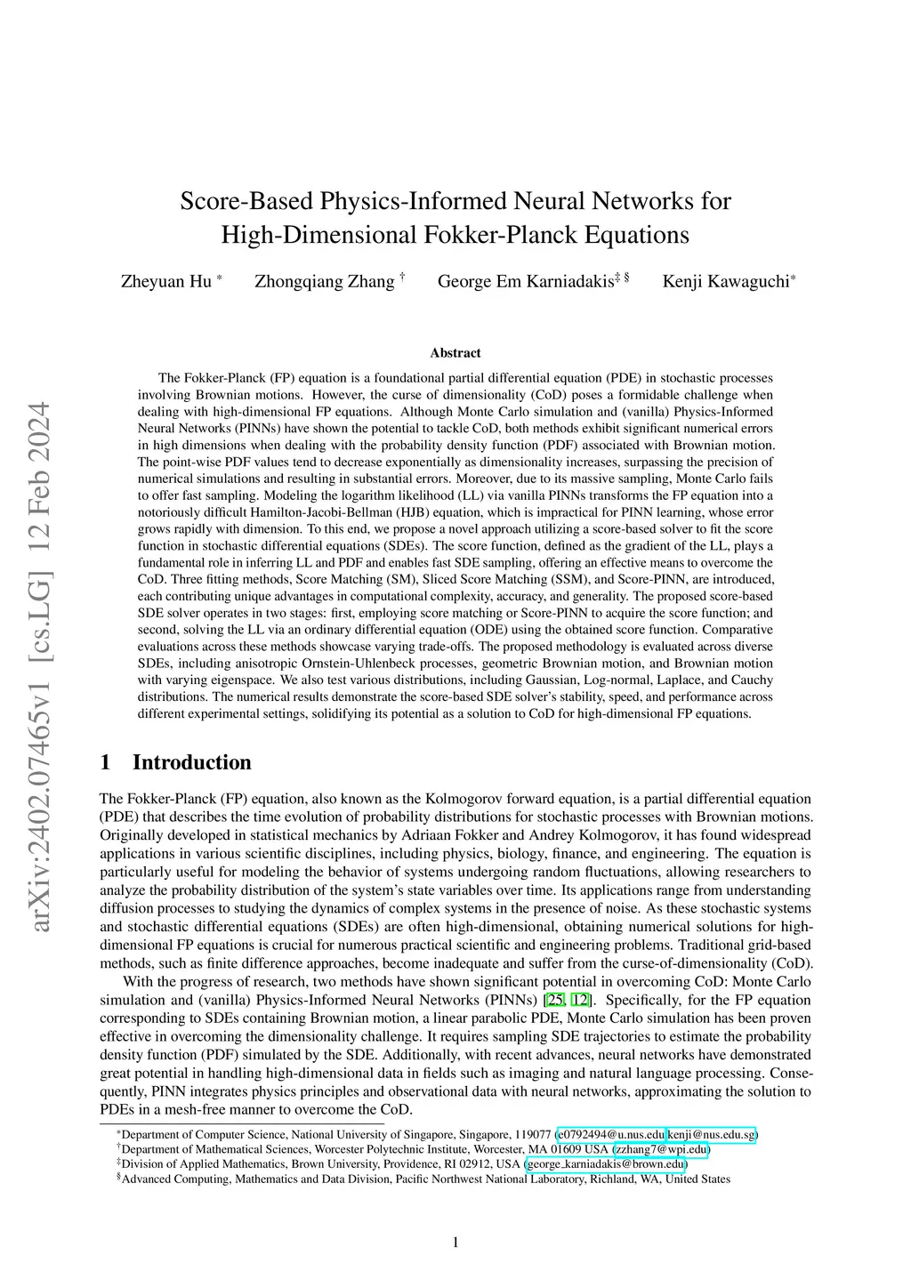 The Fokker-Planck (FP) equation is a foundational PDE in stochastic processes. However, curse of dimensionality (CoD) poses challenge when dealing with high-dimensional FP PDEs. Although Monte Carlo and vanilla Physics-Informed Neural Networks (PINNs) have shown the potential to tackle CoD, both methods exhibit numerical errors in high dimensions when dealing with the probability density function (PDF) associated with Brownian motion. The point-wise PDF values tend to decrease exponentially as dimension increases, surpassing the precision of numerical simulations and resulting in substantial errors. Moreover, due to its massive sampling, Monte Carlo fails to offer fast sampling. Modeling the logarithm likelihood (LL) via vanilla PINNs transforms the FP equation into a difficult HJB equation, whose error grows rapidly with dimension. To this end, we propose a novel approach utilizing a score-based solver to fit the score function in SDEs. The score function, defined as the gradient of the LL, plays a fundamental role in inferring LL and PDF and enables fast SDE sampling. Three fitting methods, Score Matching (SM), Sliced SM (SSM), and Score-PINN, are introduced. The proposed score-based SDE solver operates in two stages: first, employing SM, SSM, or Score-PINN to acquire the score; and second, solving the LL via an ODE using the obtained score. Comparative evaluations across these methods showcase varying trade-offs. The proposed method is evaluated across diverse SDEs, including anisotropic OU processes, geometric Brownian, and Brownian with varying eigenspace. We also test various distributions, including Gaussian, Log-normal, Laplace, and Cauchy. The numerical results demonstrate the score-based SDE solver's stability, speed, and performance across different settings, solidifying its potential as a solution to CoD for high-dimensional FP equations.