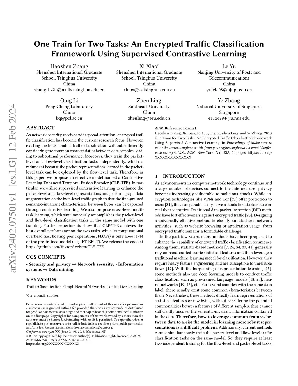 As network security receives widespread attention, encrypted traffic classification has become the current research focus. However, existing methods conduct traffic classification without sufficiently considering the common characteristics between data samples, leading to suboptimal performance. Moreover, they train the packet-level and flow-level classification tasks independently, which is redundant because the packet representations learned in the packet-level task can be exploited by the flow-level task. Therefore, in this paper, we propose an effective model named a Contrastive Learning Enhanced Temporal Fusion Encoder (CLE-TFE). In particular, we utilize supervised contrastive learning to enhance the packet-level and flow-level representations and perform graph data augmentation on the byte-level traffic graph so that the fine-grained semantic-invariant characteristics between bytes can be captured through contrastive learning. We also propose cross-level multi-task learning, which simultaneously accomplishes the packet-level and flow-level classification tasks in the same model with one training. Further experiments show that CLE-TFE achieves the best overall performance on the two tasks, while its computational overhead (i.e., floating point operations, FLOPs) is only about 1/14 of the pre-trained model (e.g., ET-BERT). We release the code at https://github.com/ViktorAxelsen/CLE-TFE